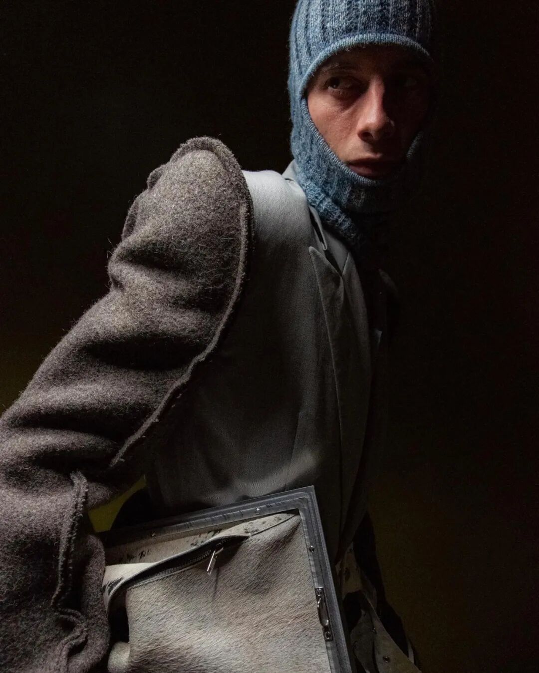 一件人字纹厚重煤色羊毛大衣上的标签写着「Bespoke Lessner and Sons(Lessner家族定制)」,Valentin在上面套上了一个带有别针的狩猎绿领。大衣袖子是用一条旧的德国联邦国防军毛毯制成,夹克则来自他祖父工作室的边角料。
