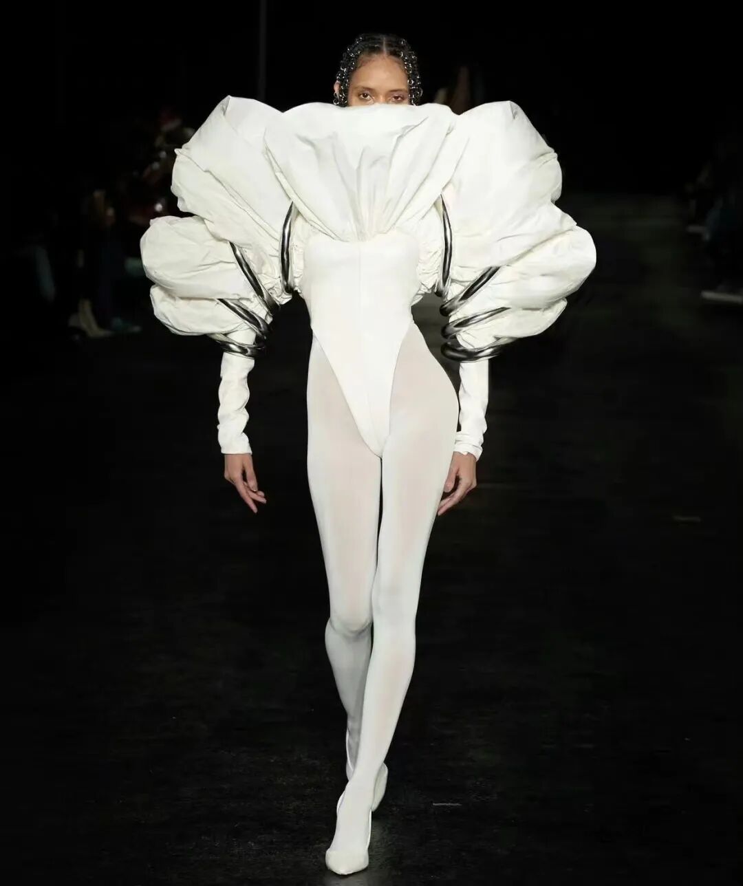 HanKjøbenhavn2021春夏系列的服装,灵感来自生物的进化以及人体不断膨胀的形状和比例。本季的服装利用肩部的延伸来增加造型感,拉长的剪裁使得衣服结构更有设计感。本季选择了大量的西装面料和皮革面料,蕾丝、荷叶边和运动衫的加入也让休闲和正式两种风格并存。