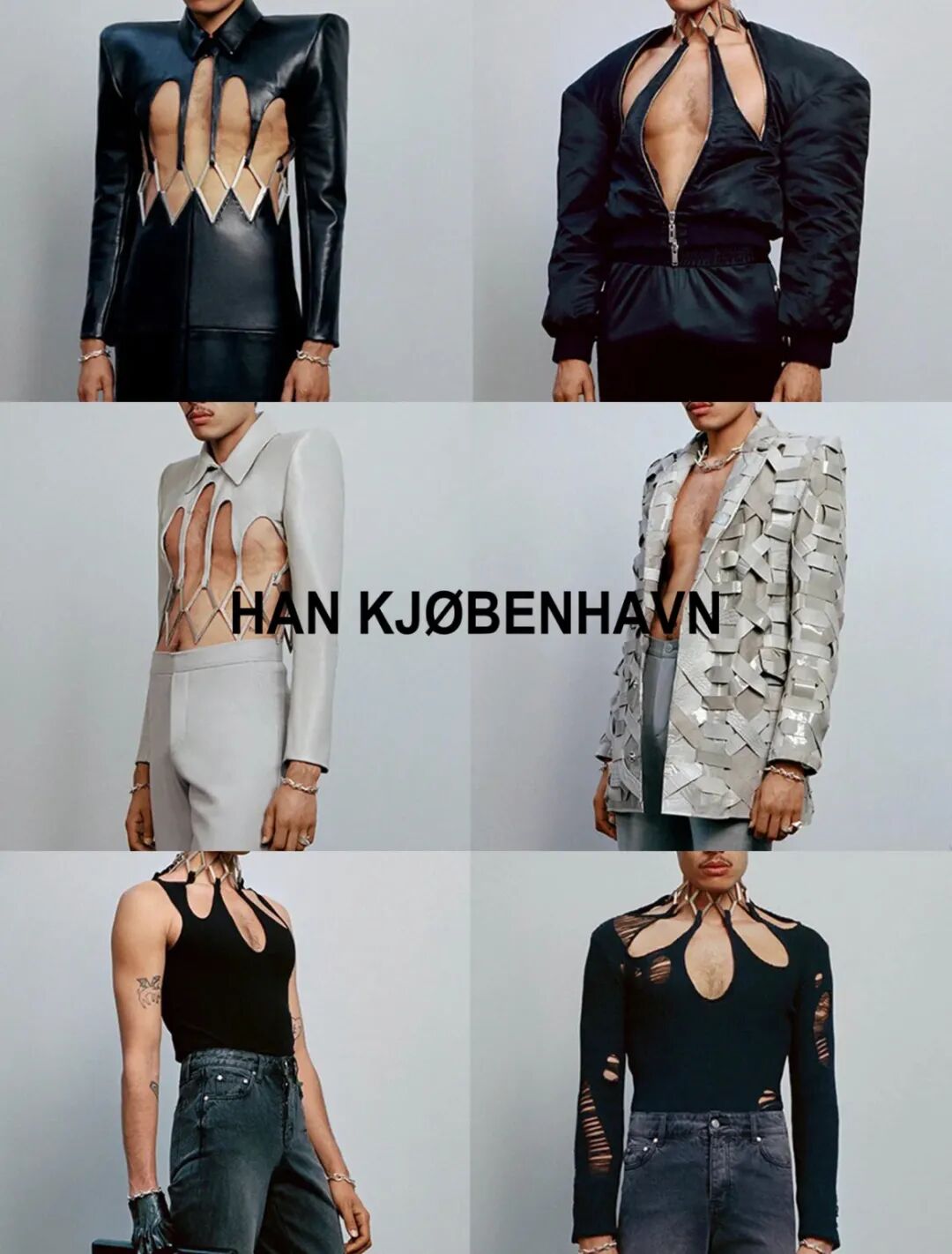 这一系列的主题是“雕刻黑暗”,在这一系列的所有服装里几乎都是深色调,充斥着一种黑暗风格,Han Kjøbenhavn的春夏男装系列是以“末日重生”为设计主题的,服装大多以怪诞的方式呈现给众人。