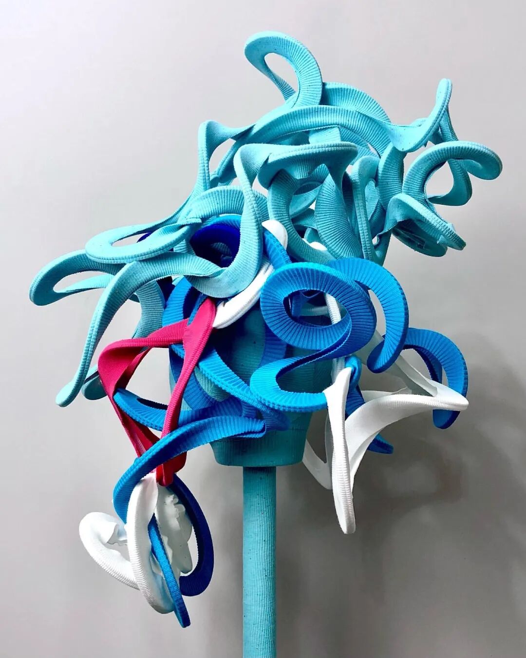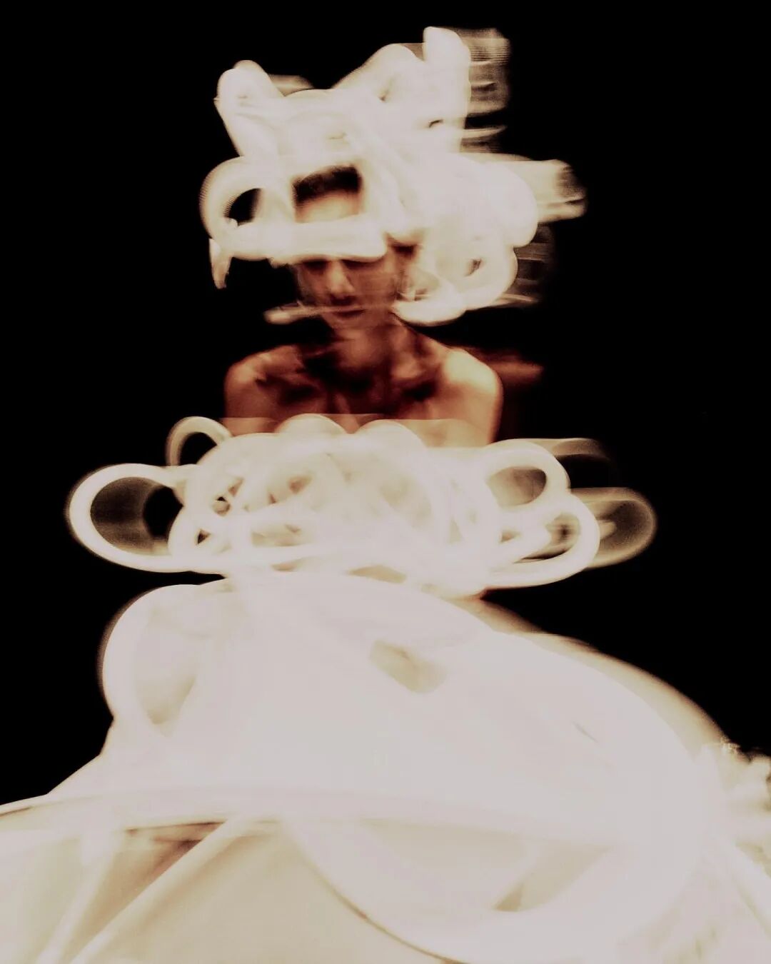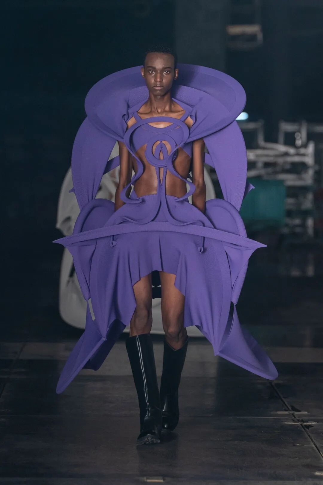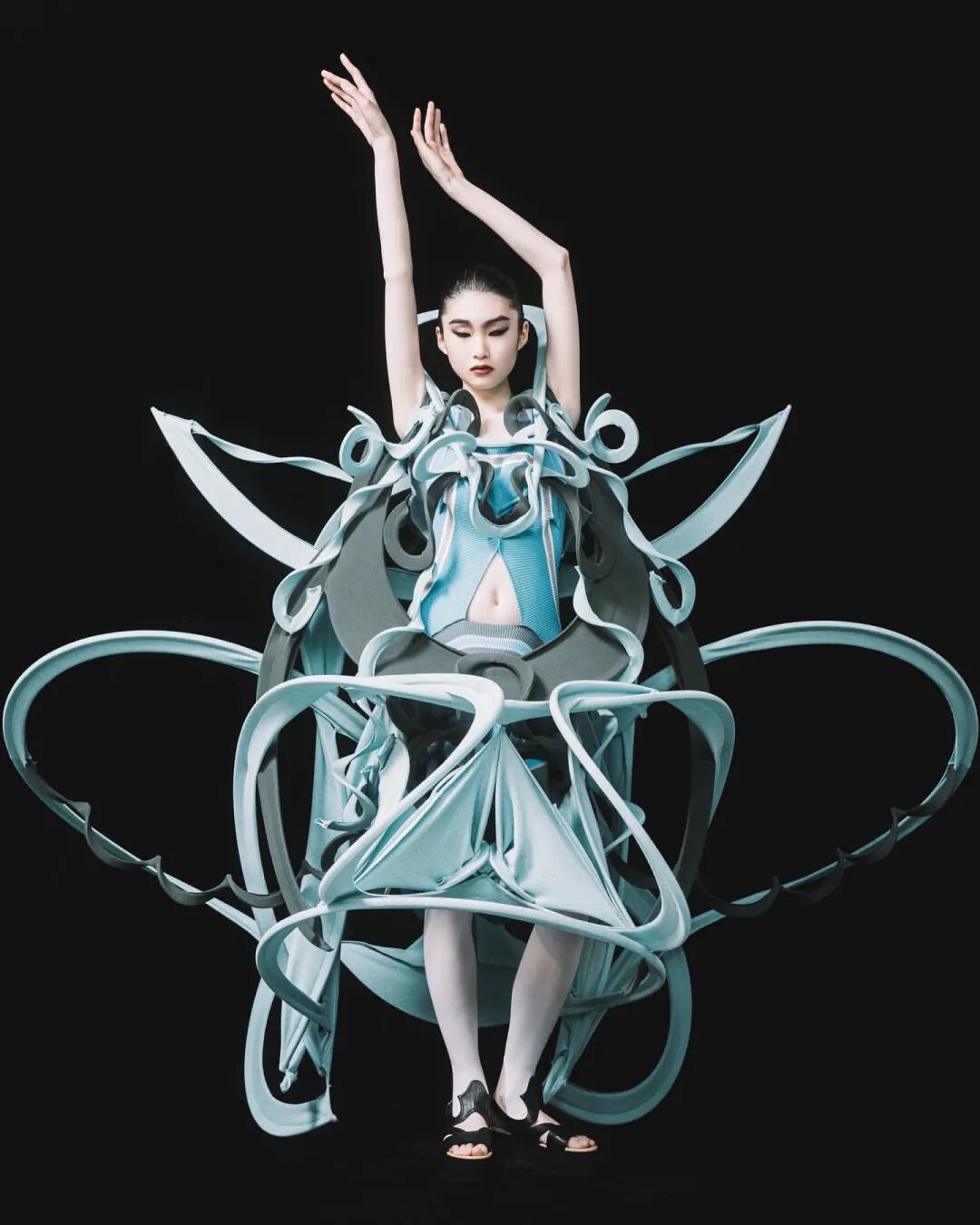 可能大多数的设计师都会以舒适性和实用性定位自己的品牌,Ryunosuke Okazaki却已戏剧又前卫的作品著称。Ryunosuke 寻求“探索与自然的和谐” 不同的轮廓从身体的各个方向凸出,创造出一种在未来派电影中像彩色昆虫一样的奇幻服装。