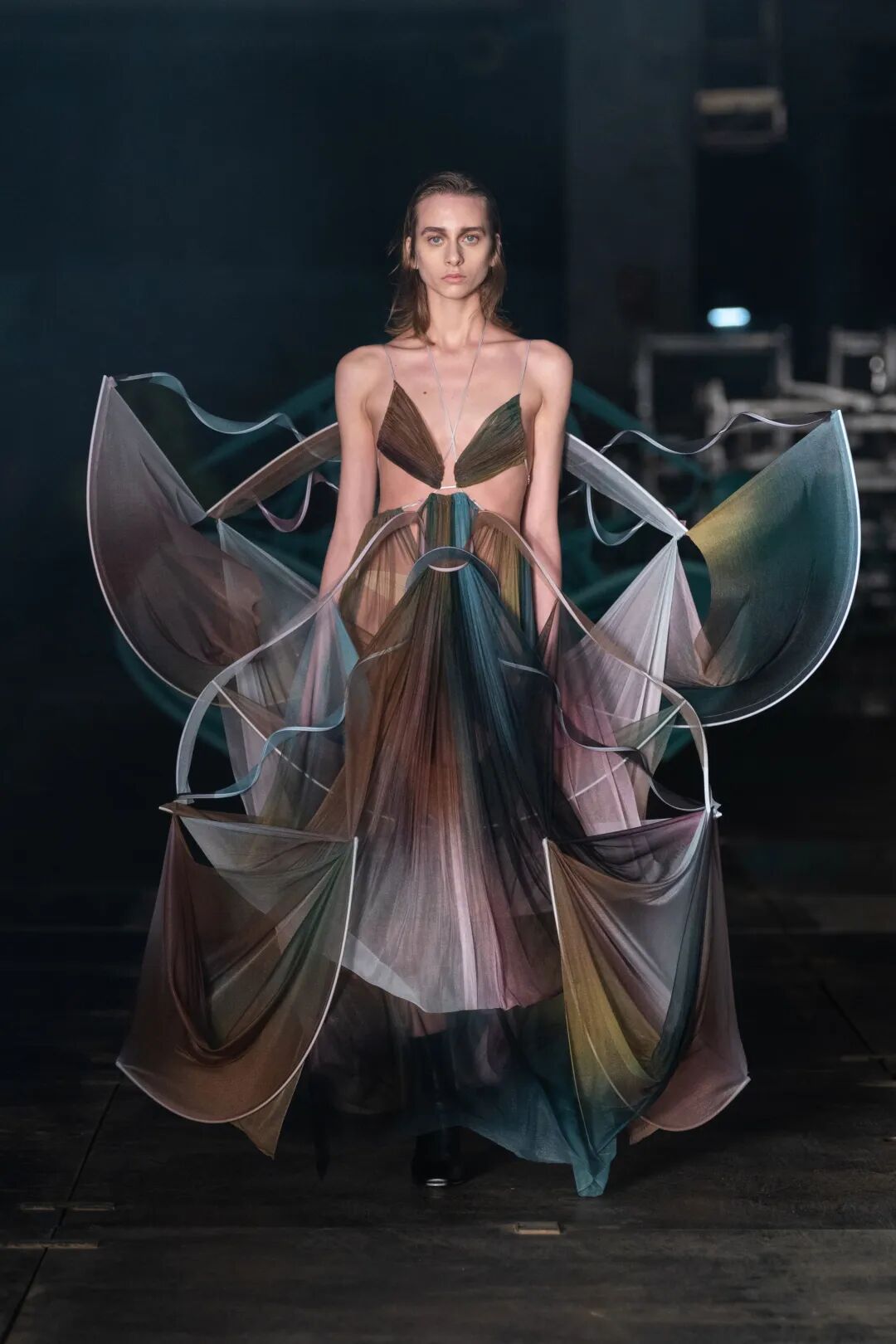 华丽的造型和雄辩的轮廓,搭配彩色人像印花的紧身胸衣,Ryunosuke 承认他更多地揭示了人与自然之间的关系。从凡尔赛到威尼斯,再到神秘的东方,大胆的态度和摆脱传统的自由正是吸引他的原因。