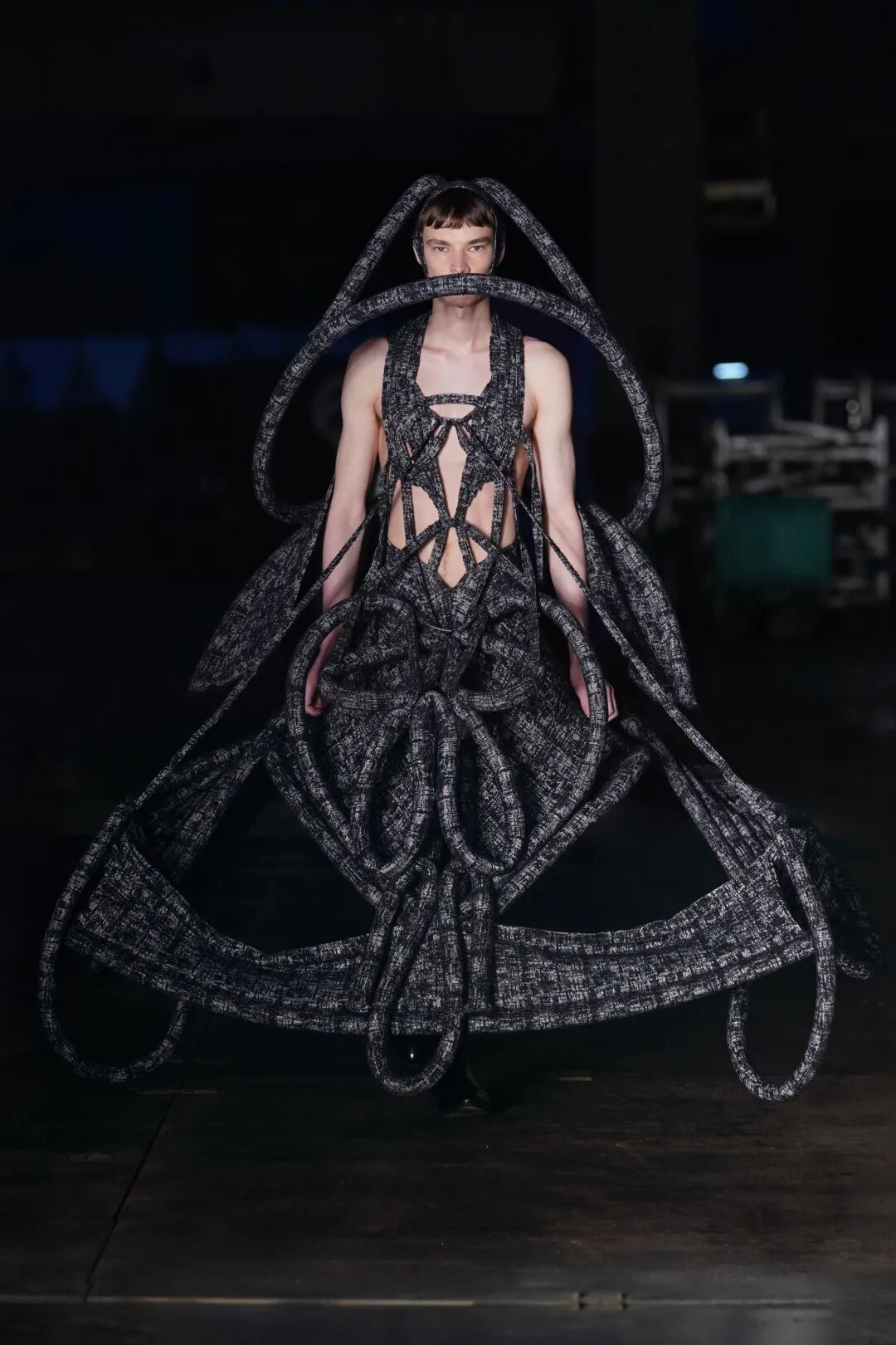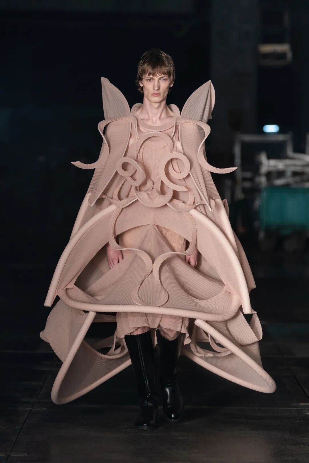 “我更关注装饰而不是功能。”Ryunosuke Okazaki所展示的服装倾向空间性的表达,它们散发出一种类似于兰花(雌雄同体)的异域性感气息,似乎完全超越了性别。