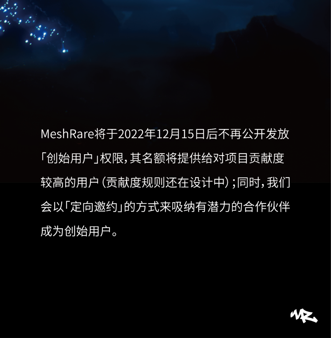 但即便如此,作为成果来说,MeshRare也达成了阶段性的销售预期,并积累了一批质量极高的创始用户。而12月15日以后,将不再公开发放「创始用户」权限,其名额将提供给对定向邀约以及对项目贡献度较高的用户获得。