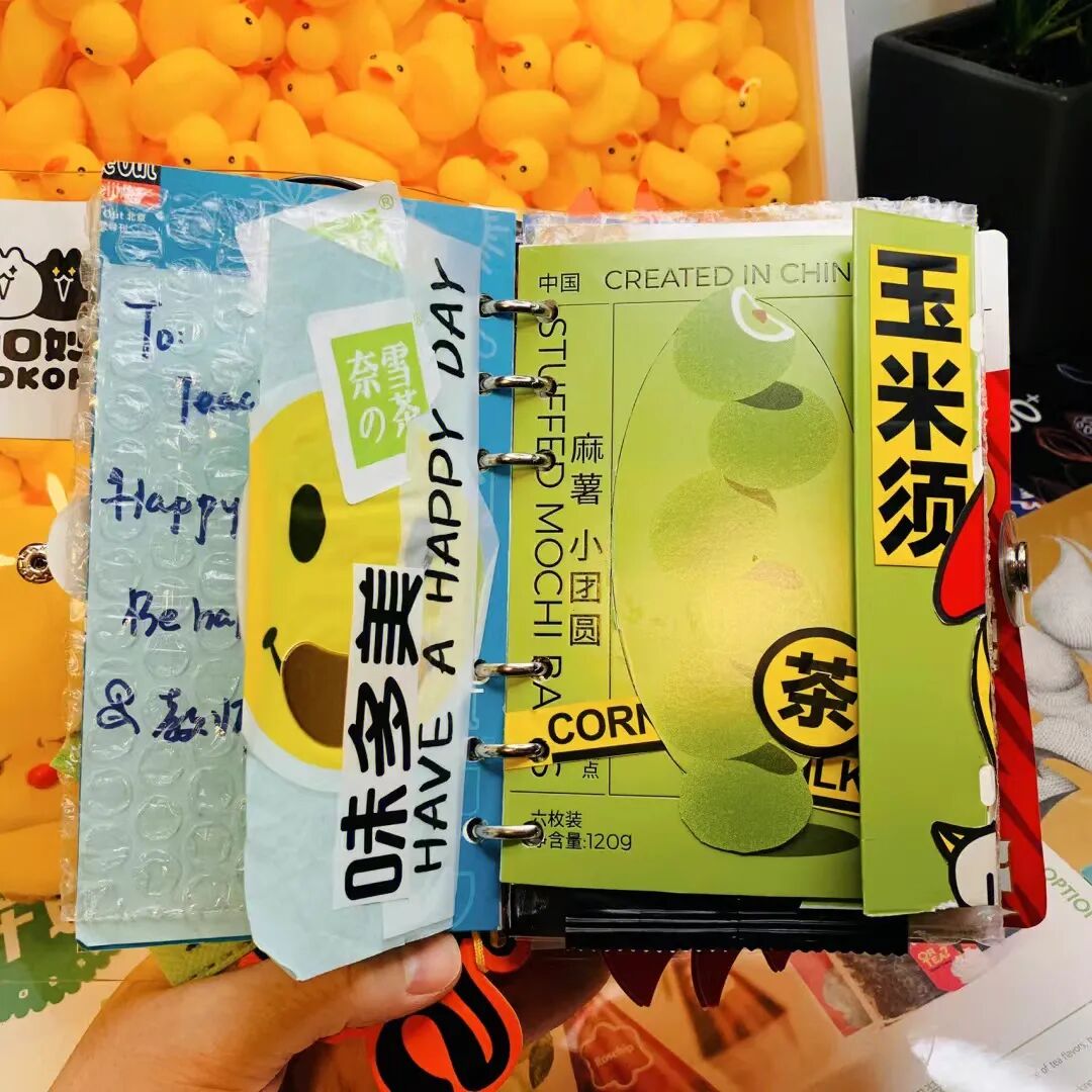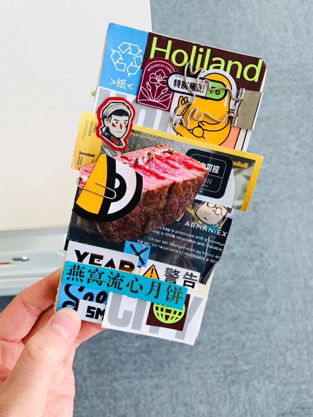 我平时也会收集一些“垃圾”,就是日常的一些生活用品、包装。但正式收集在今年五月份,北京疫情严重,我居家隔离时无意当中刷到小红书,我看有人把这些搜集来的“垃圾”做成本子,我说这个想法不错,我也做。
