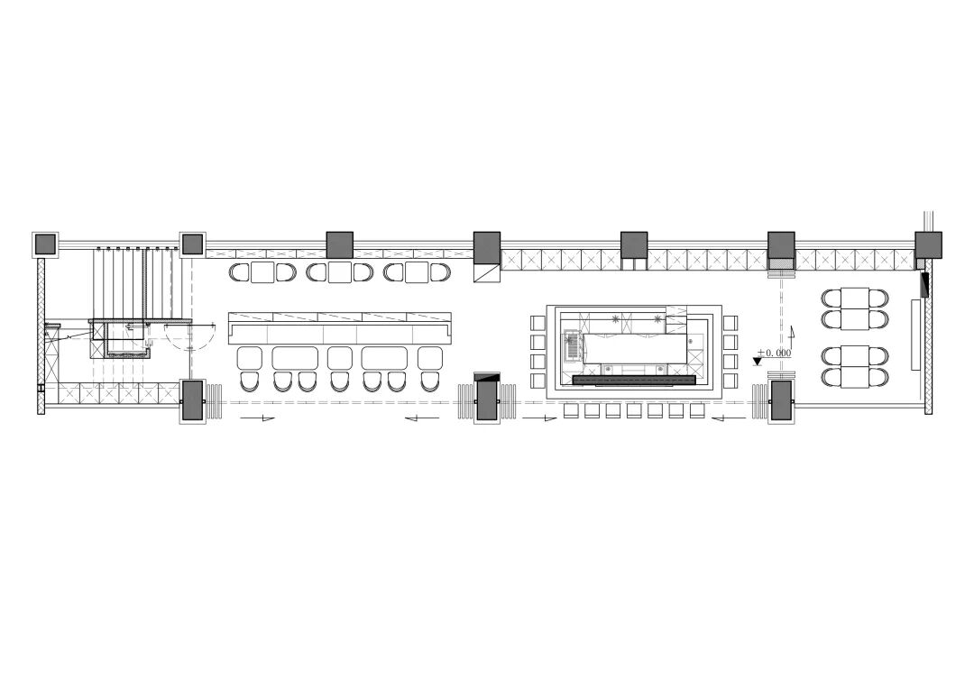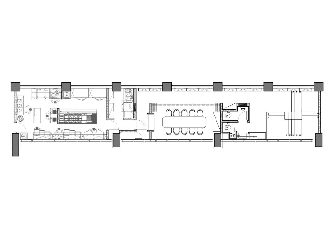 此次的项目场地是由建筑体的斜对角上下两层楼组合而成,实际空间上宽度为18米,然而深度却仅有3.5米,在我们初次走进项目现场时,整个视觉感就像是一条很长的走廊。