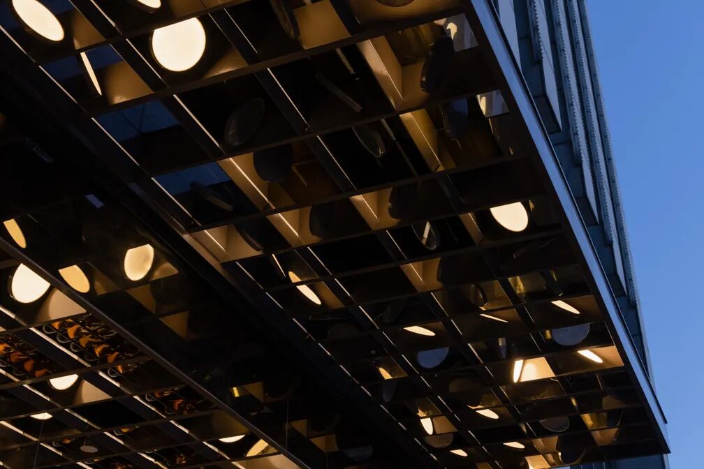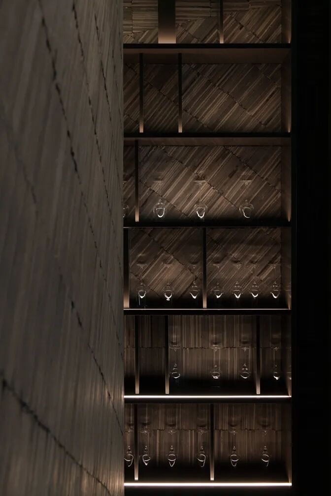 搭配灯光与镜面的巧妙折射,就像是置身在一条奇妙的时空隧道之中,由右至左渐近式放大的方格,也肩负了小酒柜的职责,增加了穿梭其中的趣味体验,是隧道的末端,却好似是衔接了上二层楼梯的起点。