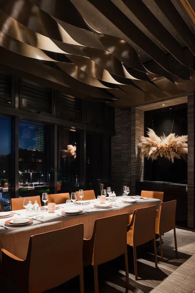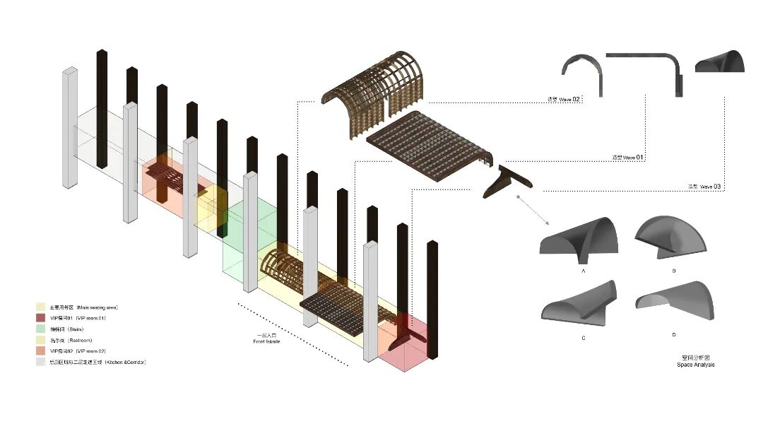 每一个空间都有其自身特殊的属性,如同各品类的葡萄酒也会有各自对应使用的葡萄酒杯,所以当我们面对着大运河的“水体”波动时,亦如想象着葡萄酒在杯中的各种“酒体”形态。就像是我们举杯欢庆之时,酒杯所碰撞出的三朵不同型态的“浪花”律动,成为了设计师将概念转化于空间之内的灵感。