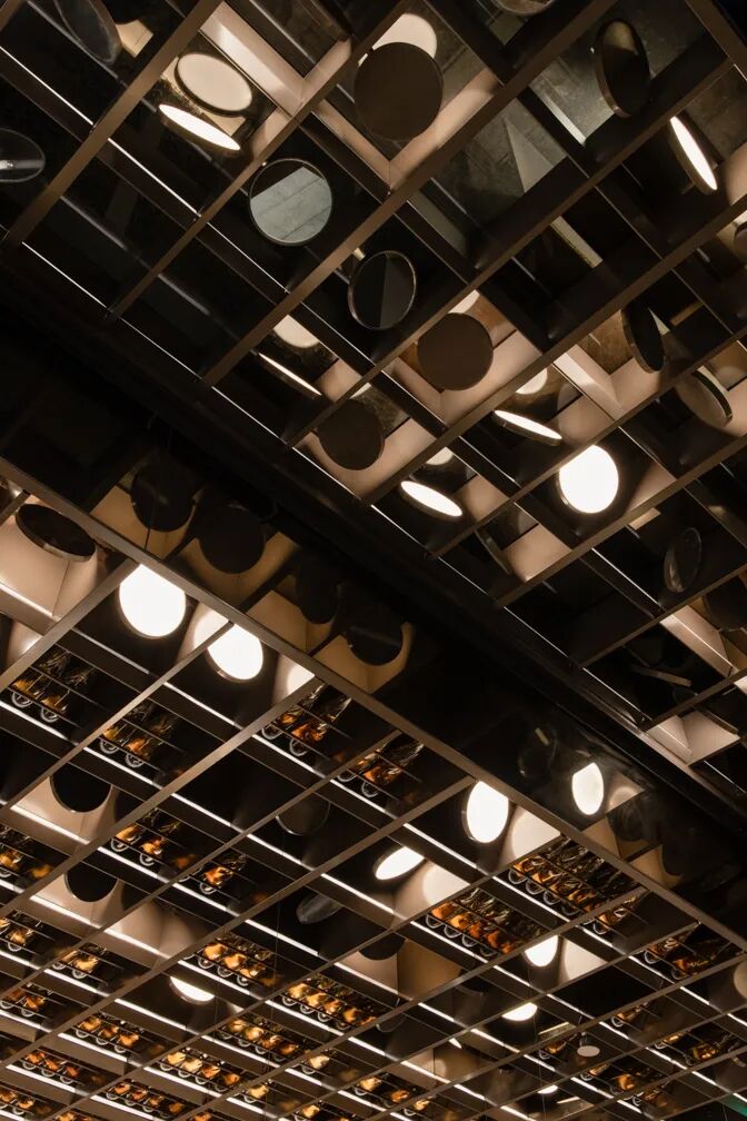因应削减长廊型空间所带来的不适感,于一层天花所使用的深灰色水波纹不锈钢以及咖啡色手敲不锈钢,从视觉上达到了波纹荡漾的效果,辅以三朵浪花不同造型及属性,让一层的三个使用空间,独立却又彼此衔接。我们将面积最大化的去使用,大胆地采用乱序法在酒柜的方格之中呈现灯光,随机出现的灰色圆镜将光线复制叠加,在视觉上艺术化地还原了阳光洒满水面的波光粼粼,也如同酒在酒杯里的闪光面,让人身在其中,又抽离其间。