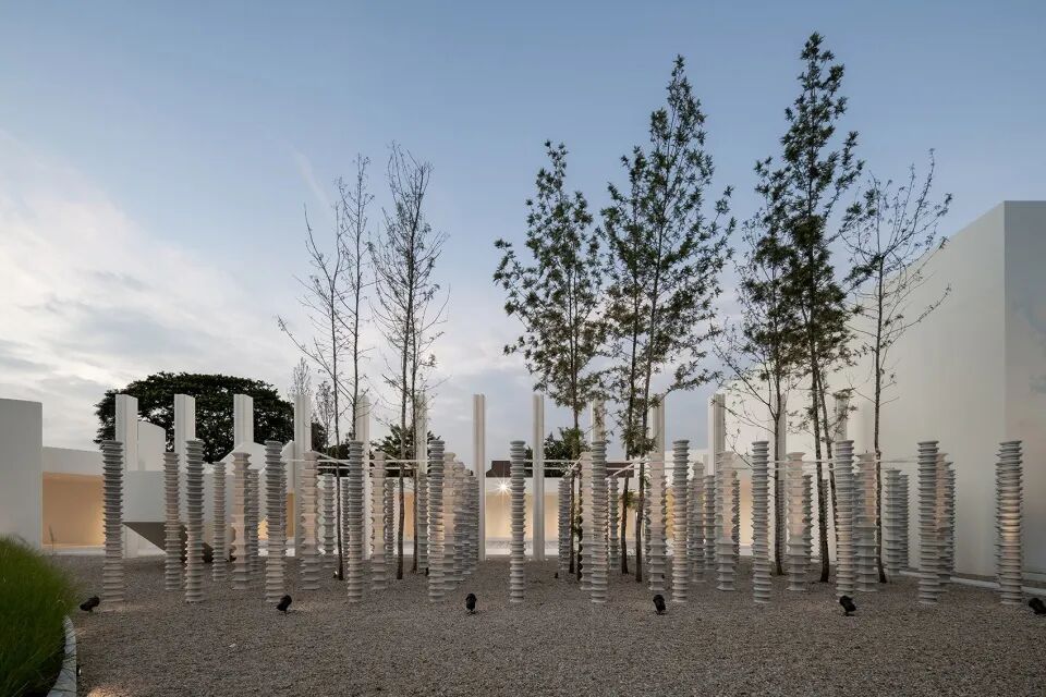 立柱花园是一个供客人探索和拍照的空间,它与节点空间共同围合出一个多用途的庭院