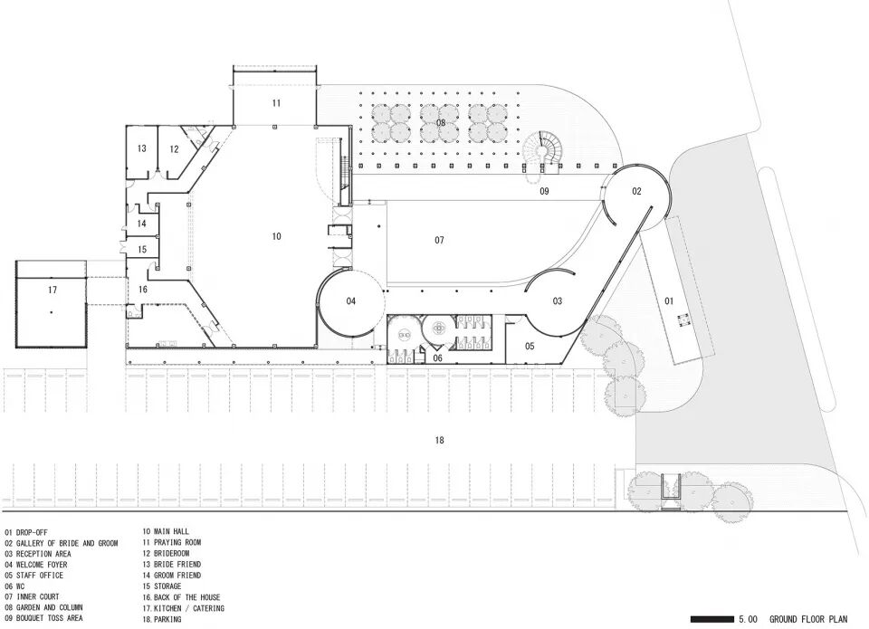 新娘和客人的房间、餐饮设施和储藏室等功能性的辅助空间均设置于婚礼主舞台的后方。
