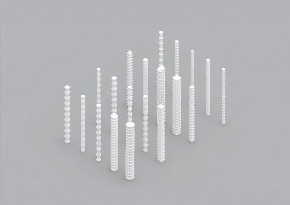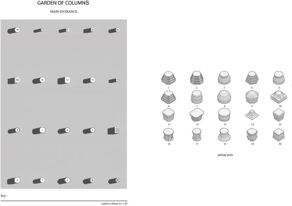 在另外一个区域,设计者营造出一片“立柱花园”,这些柱子是由5种不同类型的柱头叠加而成,随后以网格的形式排列。