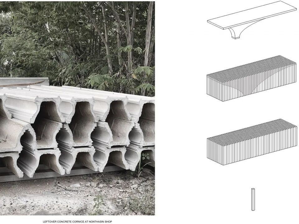 Found婚礼场地的设计以曼谷的一家历史悠久的灰泥材料铺“Nothasin”为灵感,对其古典立柱、柱头和柱檐进行了新的诠释。