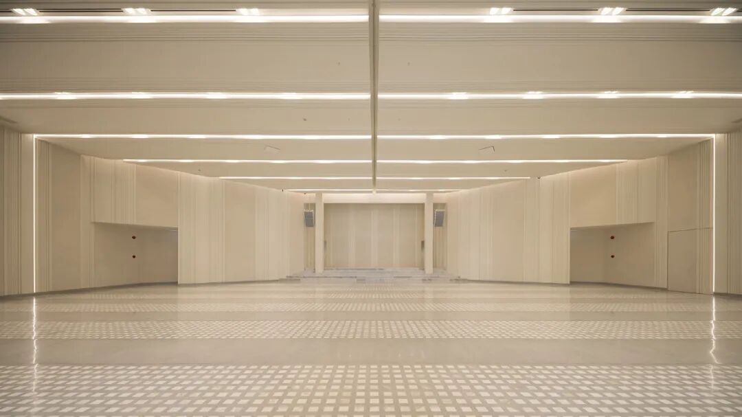 立柱又一次成排地出现,构成了质感细腻的大厅内墙。