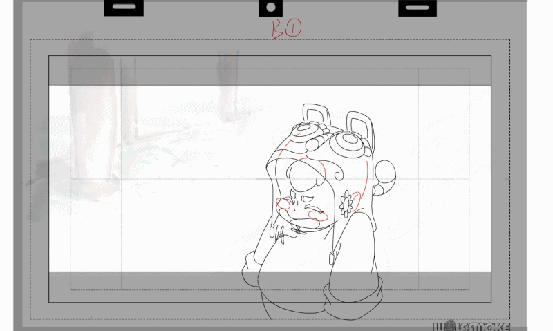 “第一遍”动画需根据原画指示进行描线和中间过渡动画的绘制,之所以会有“第一遍动画”是因为通常动画就只有一道工序,但是我们的动画需要把单线稿变成有粗细变化的线条,因此需要进行两遍动画绘制。这“第一遍”动画就是先对原始线条进行简单清稿描绘。
