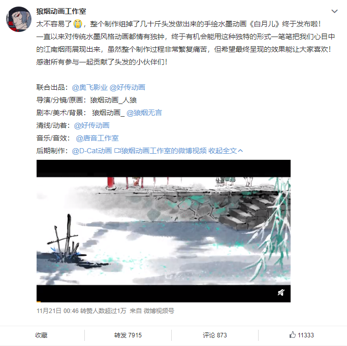 虽然动画只有短短8分钟,丰富的动画经验使得团队对剧情的叙事把控依旧完整,短片一经放出,水墨效果所带来的独特美术风格表现十分亮眼。