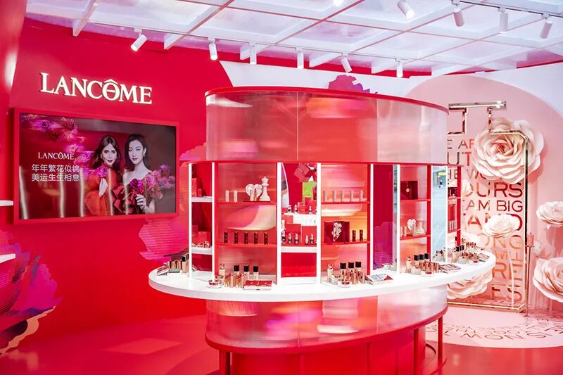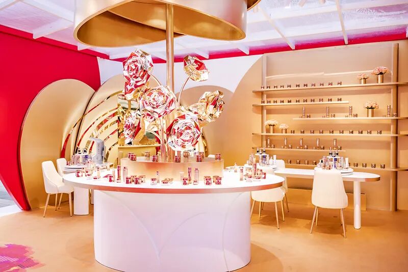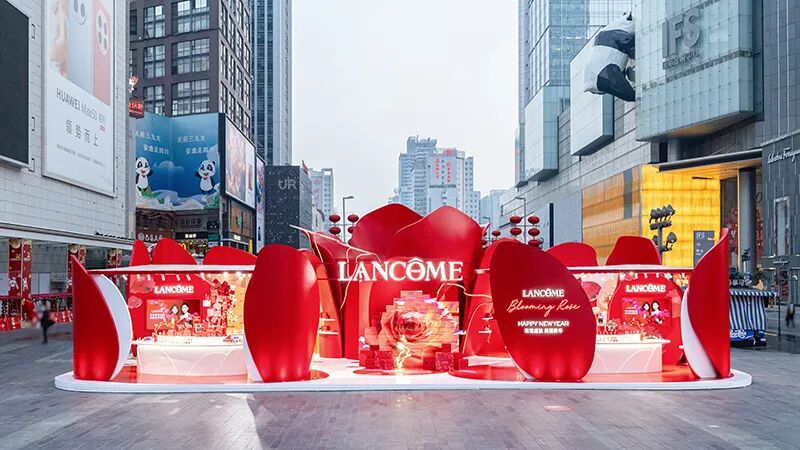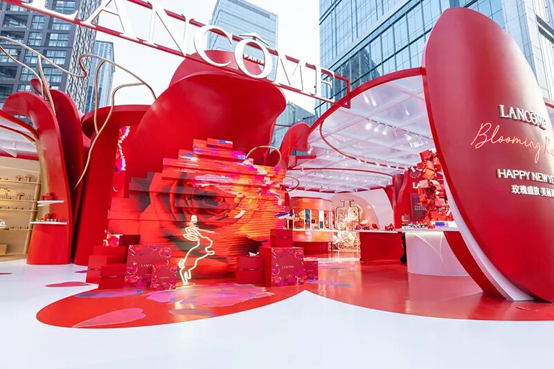 兰蔻新年快闪店位于成都春熙路红星路,快闪店设计以品牌标志性的玫瑰为灵感,整体像是盛开的玫瑰。而店内则带来了多个菁纯、彩妆、香水及全品陈列区,每个区域也以花瓣环绕,在进行分隔的同时也寓意了幸福美满。