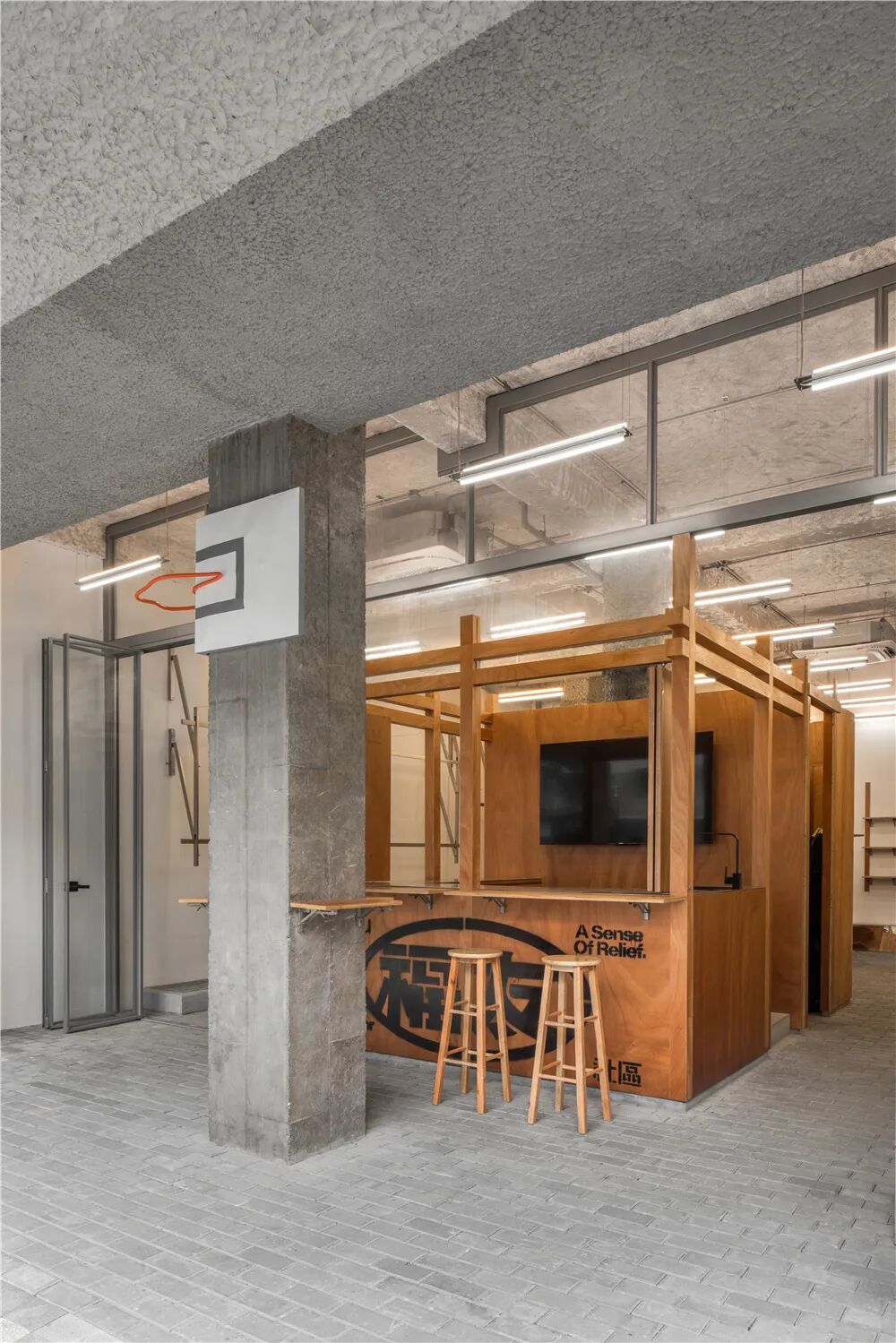 来源于品牌主理人自小生活在弄堂打篮球的记忆,篮球空心入框的声音成为了品牌名字phew的由来,借由这份单纯的欣喜,phew希望每一个热爱运动的年轻人都能简单纯粹,体面自信。say architects受其委托,在杭州市区打造第一家线下门店,面向所有人开放。