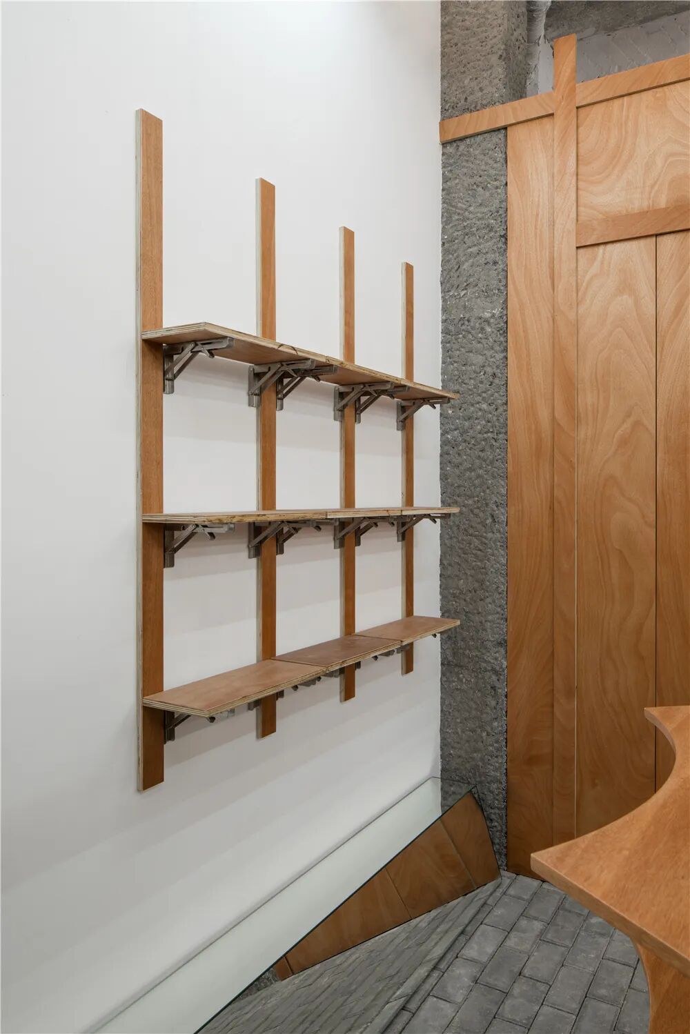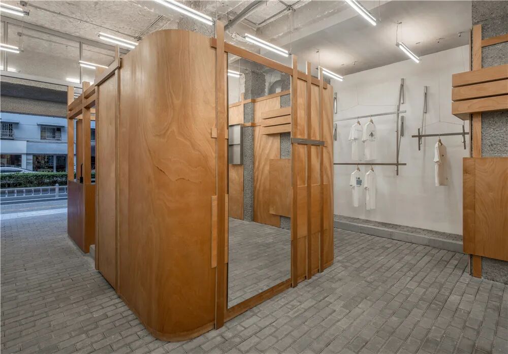 空间内部放置了四个“小房子”,分别承担咖啡、试衣间、仓库和卫生间的功能。他们不与空间发生硬接触,而是见缝插针式的存在于结构中,老人们常说,修修补补又是一年,胶合板的随机拼接、外挂的功能体块、拐弯抹角的房子形态共同建构了老底子的生活形态。