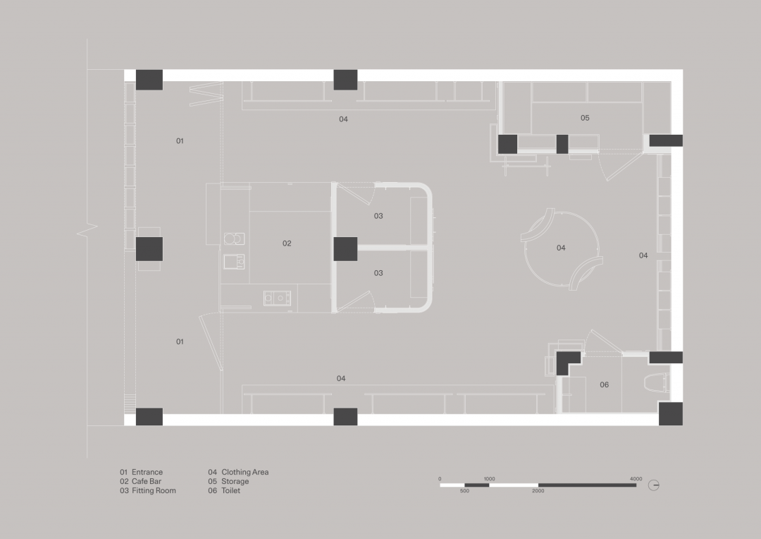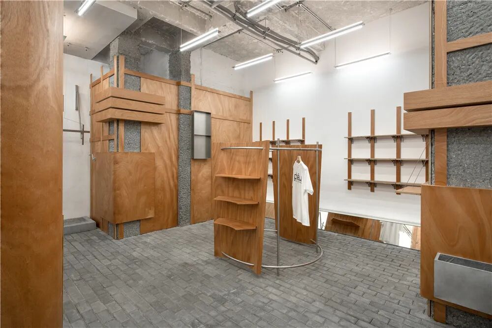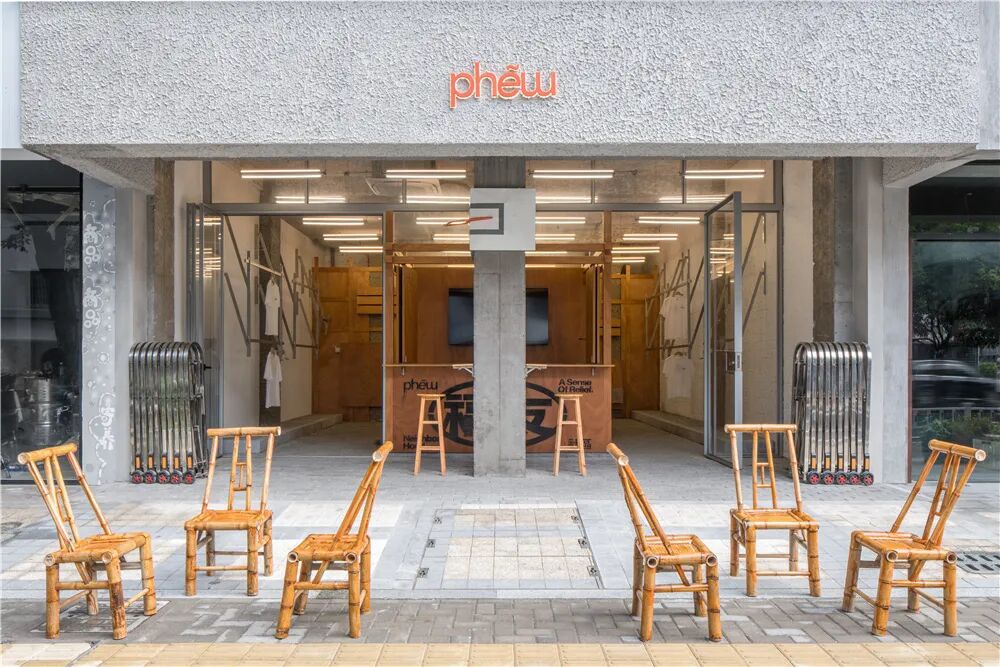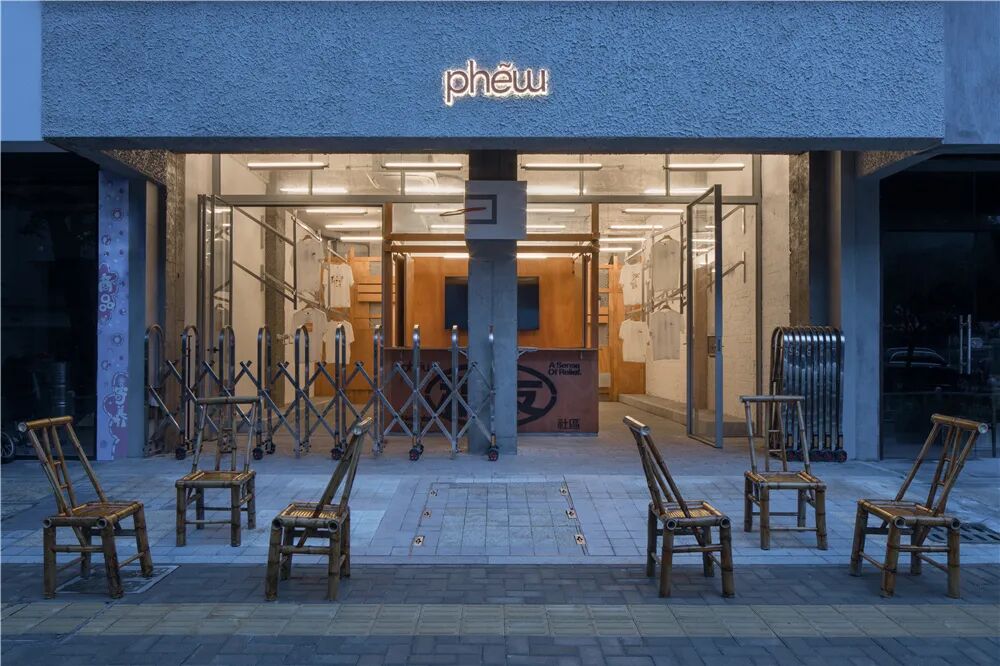 设计概念以“弄堂走步”展开,人行道砖被铺设至场地内部,内部空间自然形成了街道的一部分,成为了街区里的一个弄堂。区别于传统商业,phew打开式的门头对外营造开放、自由、轻松的状态。