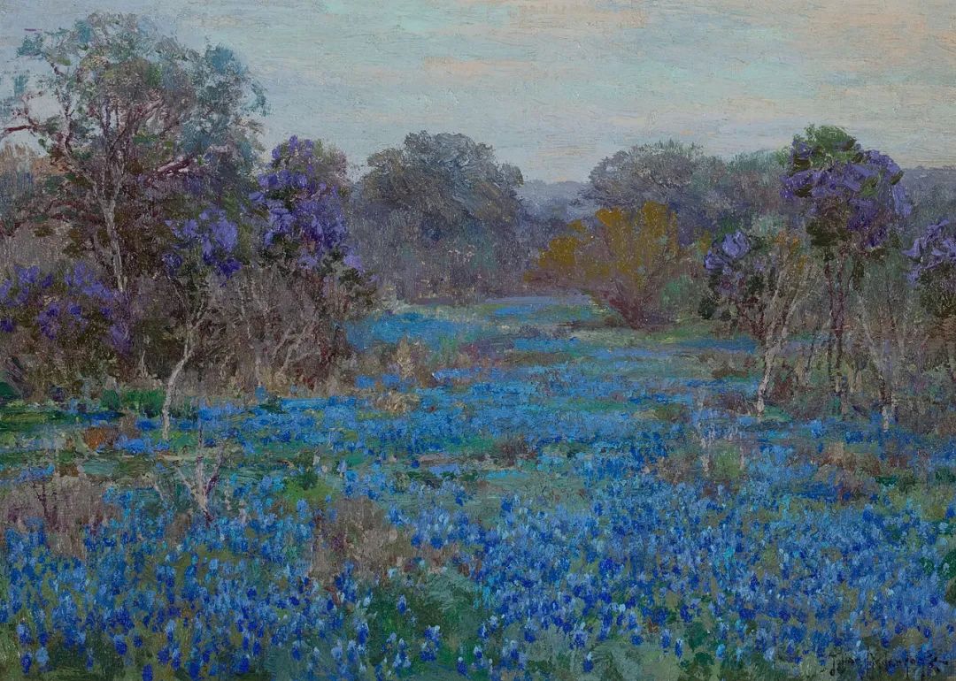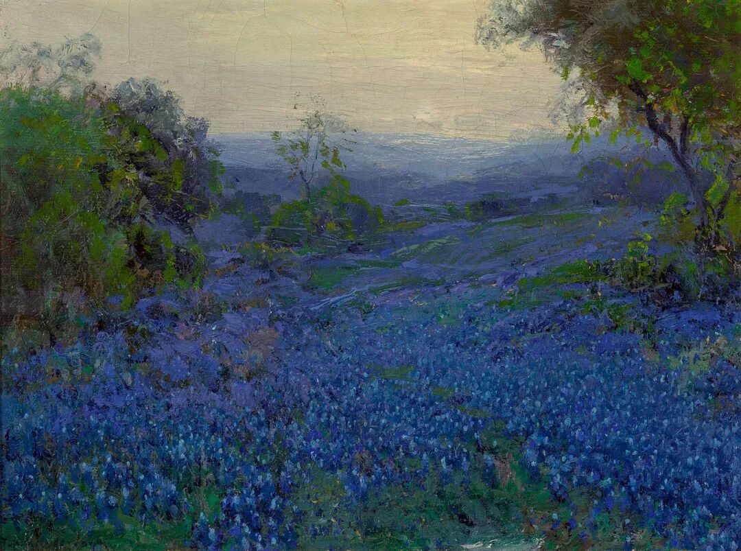 《傍晚的蓝帽花海》Blue Bonnets at Late Afternoon,1915,布面油画,25.4 x 35.5cm。德州圣安东尼奥艺术博物馆(San Antonio Museum of Art)。