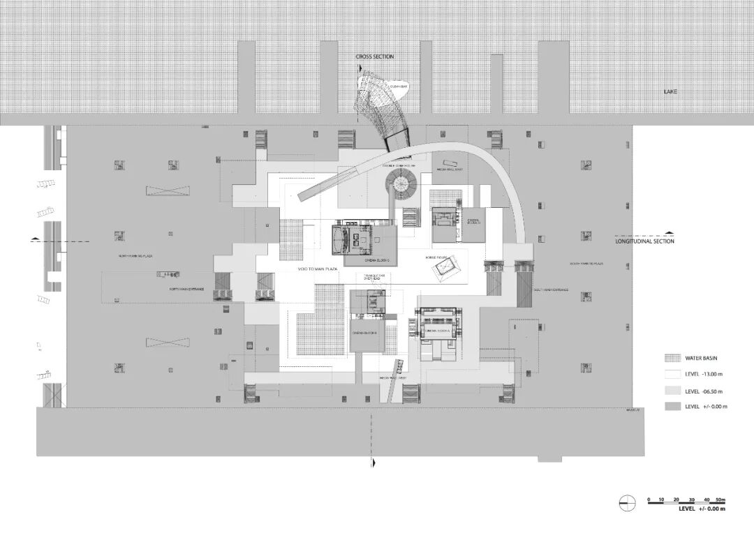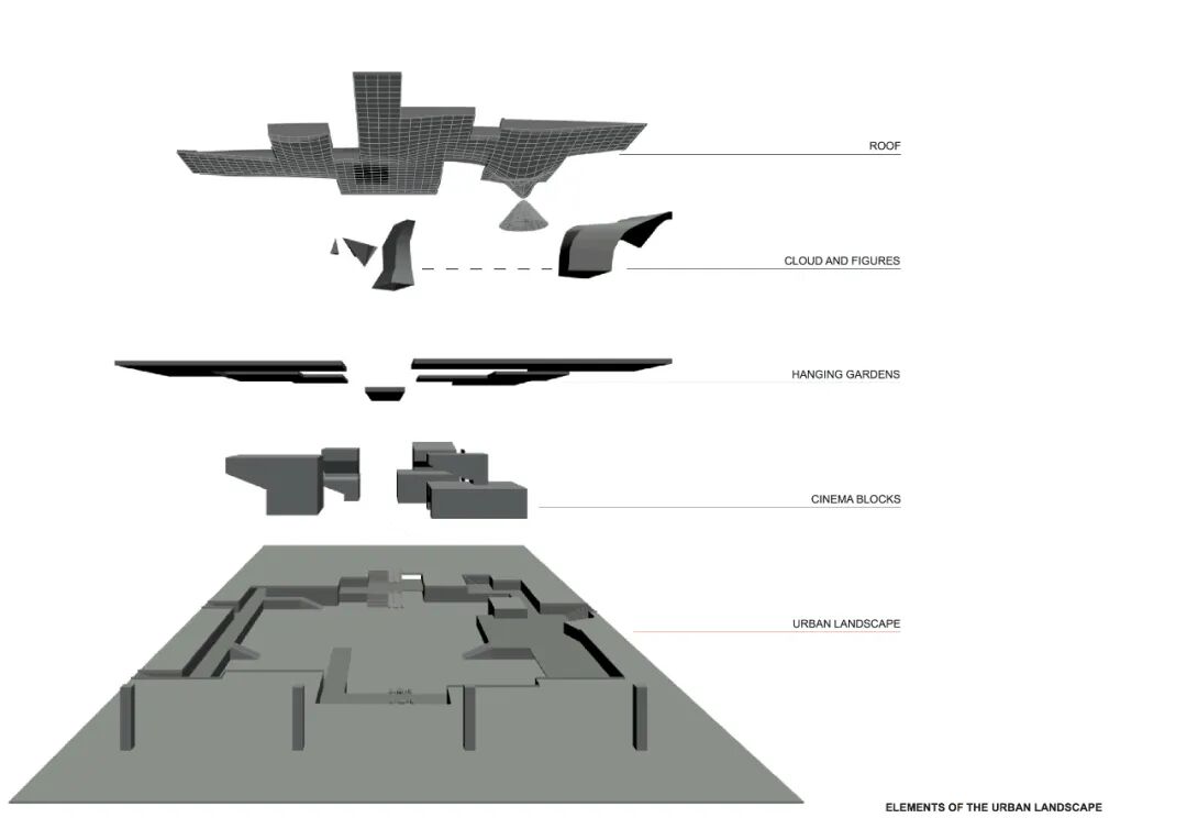 这一建筑群中包含了五个重要元素:地面“层”、影院“块”、购物“平台”、雕塑“物”及屋顶。其中,地面“层”部分被打碎、下沉形成了中央下沉广场。广场包含了电影院区域,并引导人们通往项目中各个其他不同的功能区。而如购物“平台”等跃层式架构则位于地面层下,其两侧为电影院及广场,并包含了商店、泳池、健身区及办公室等各个功能空间。