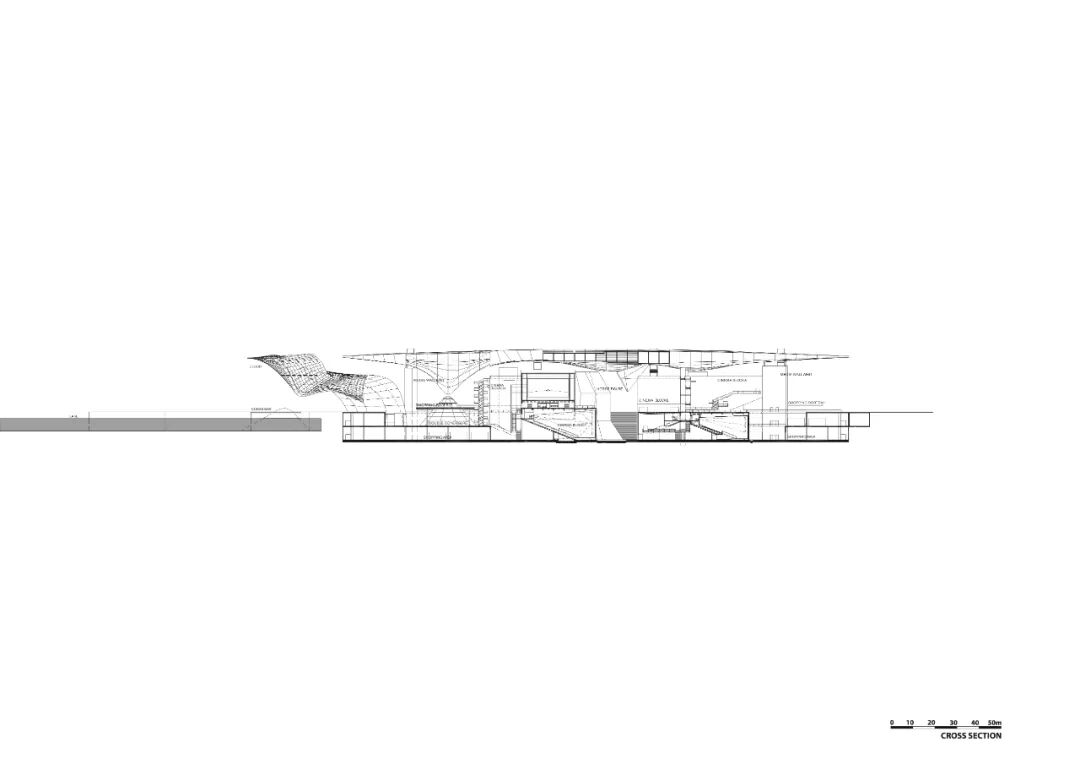 不同的交通元素在建筑中创造了不同的动线模式。建筑群四周的楼梯将城市景观折入下沉广场,让人们可以自由、流畅地穿梭于建筑群。而其他楼梯及坡道则将上层的电影院、餐厅、以及位于雕塑架构中或电影院体块上方的酒吧及俱乐部连接在一起。