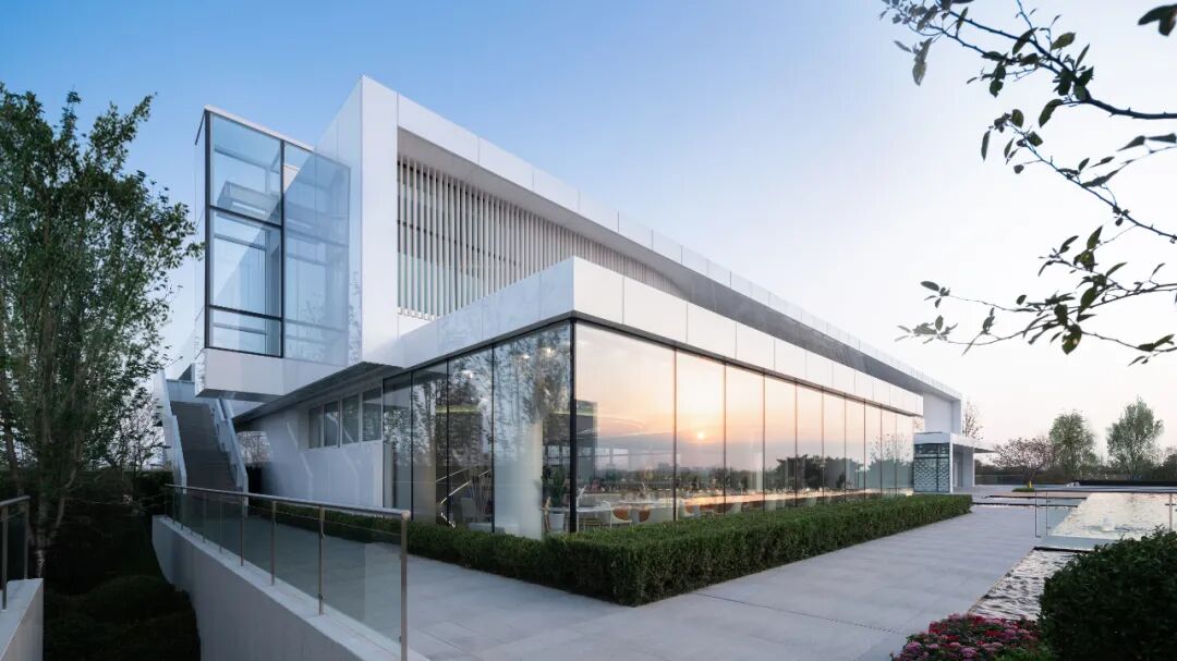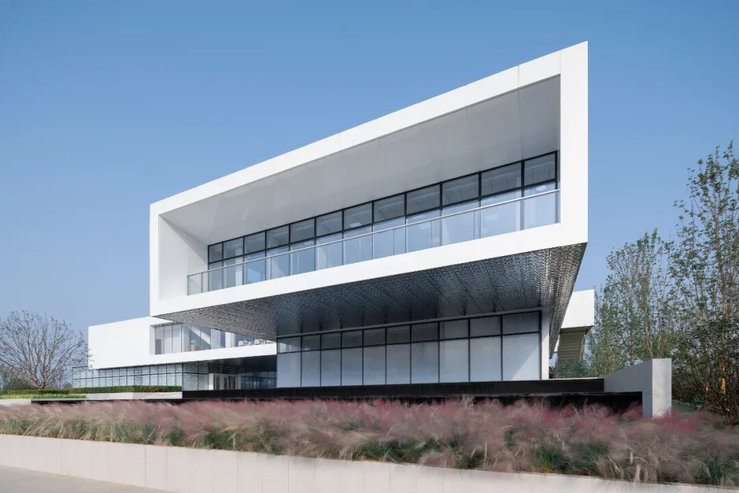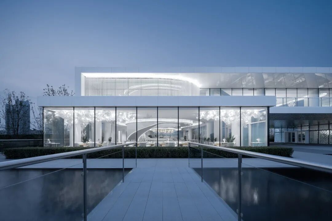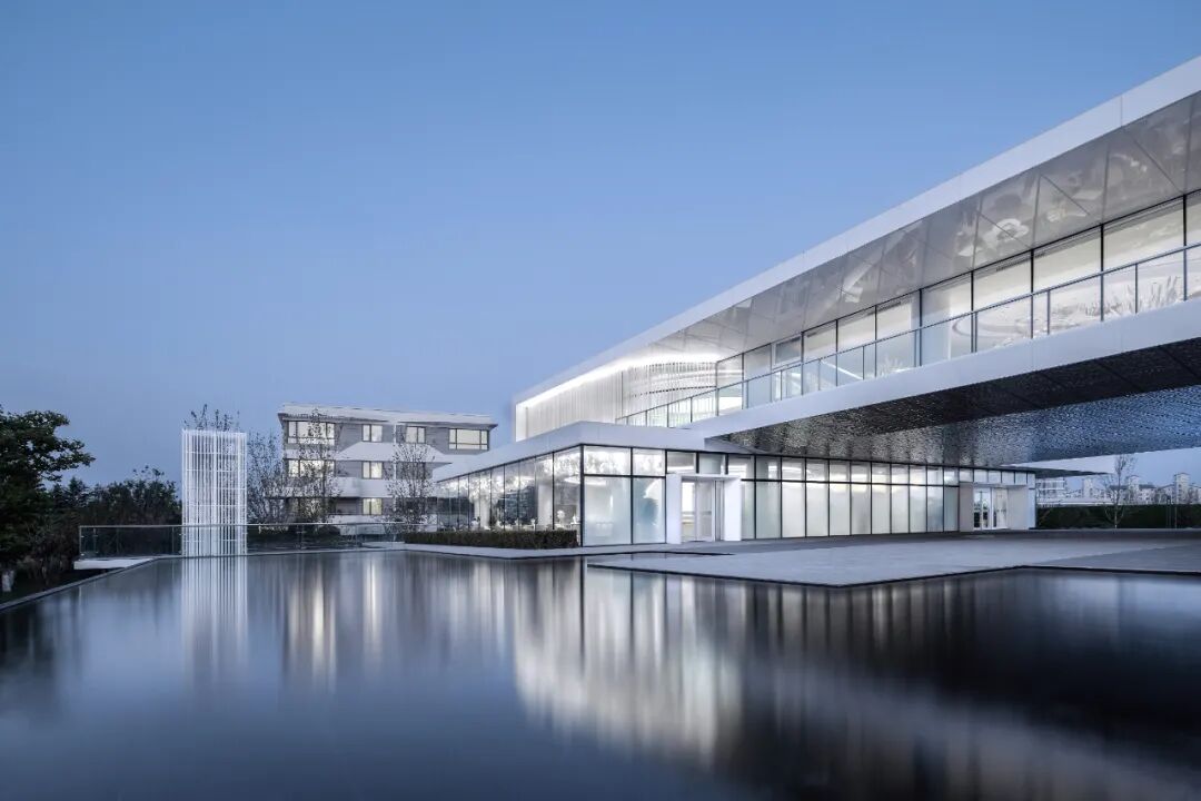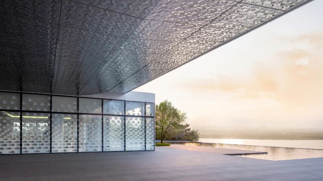 立面采用的幻彩铝板在不同角度、不同时刻的光线下,随着周边环境的变化,展现着不一样的光彩,力图与大自然来一场美丽的对话。架空区域顶部的水波纹板与樱花湖交相辉映,更是为空间体验上增添了不少趣味感。