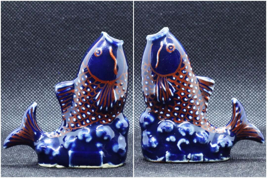 这只回青釉画矾红鲤鱼水注以瓷塑的方式,展现了一条肥大的鲤鱼,昂首跃于波涛之上,动可鱼跃龙门,静得鱼水之欢。
