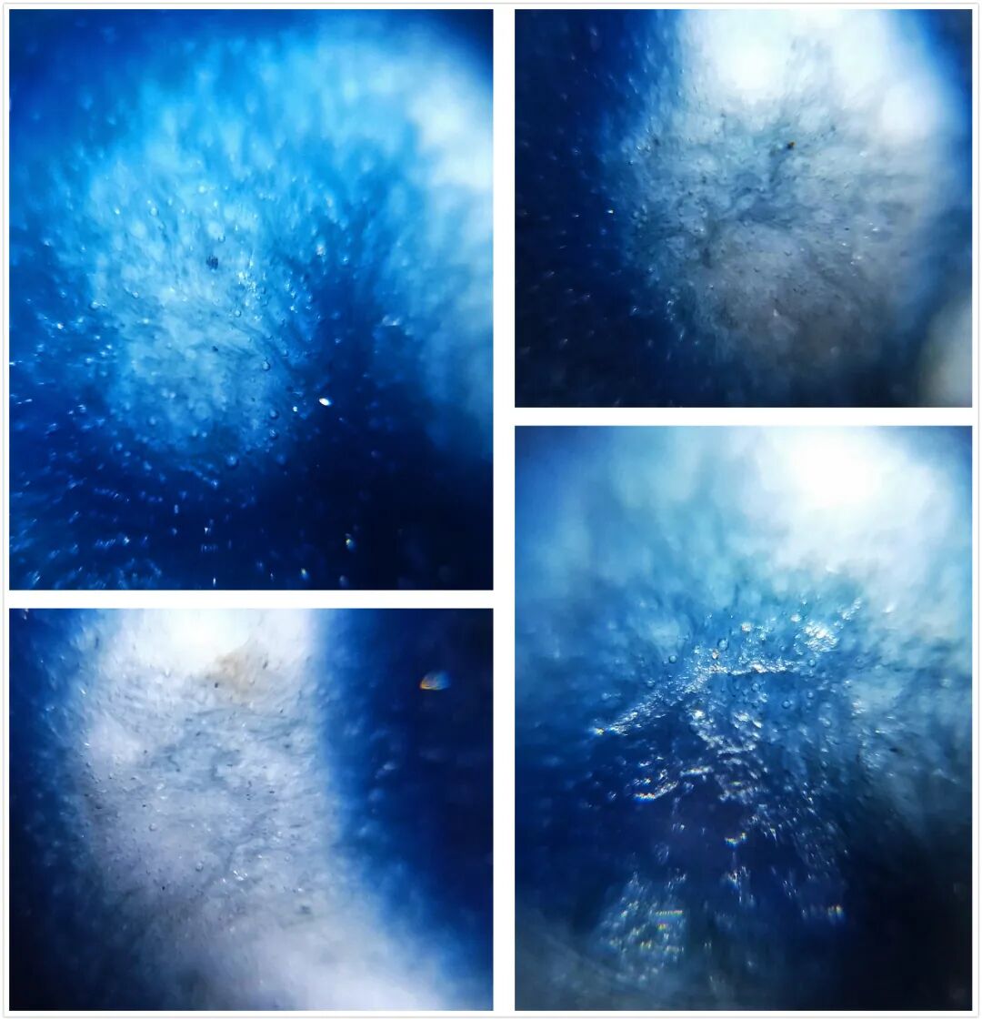 微观视界中,釉下气泡疏密有致,老化气泡并不多见,但次生结晶明显,如星云又似波涛一般。