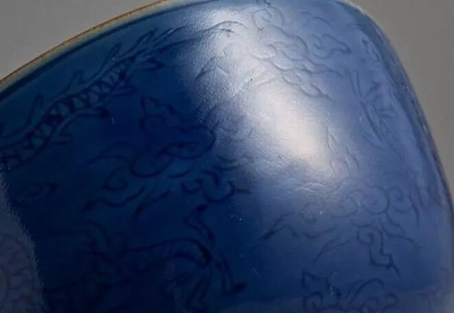 明嘉靖回青釉瓷器蓝中泛紫红,这是鉴别明嘉靖回青釉瓷器重要方法之一;由于施釉多比祭蓝釉瓷要薄,釉面透明度好,所以釉下多有暗花装饰。