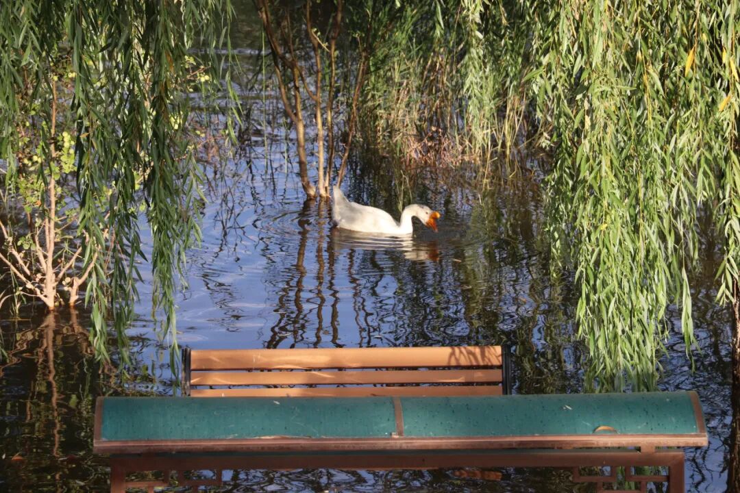 和好友漫步经过的某个公园,河水已经将步道淹没,只露出步道边展板的上端。