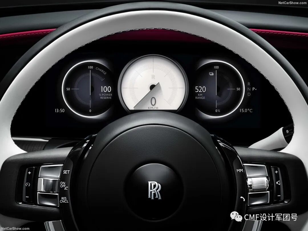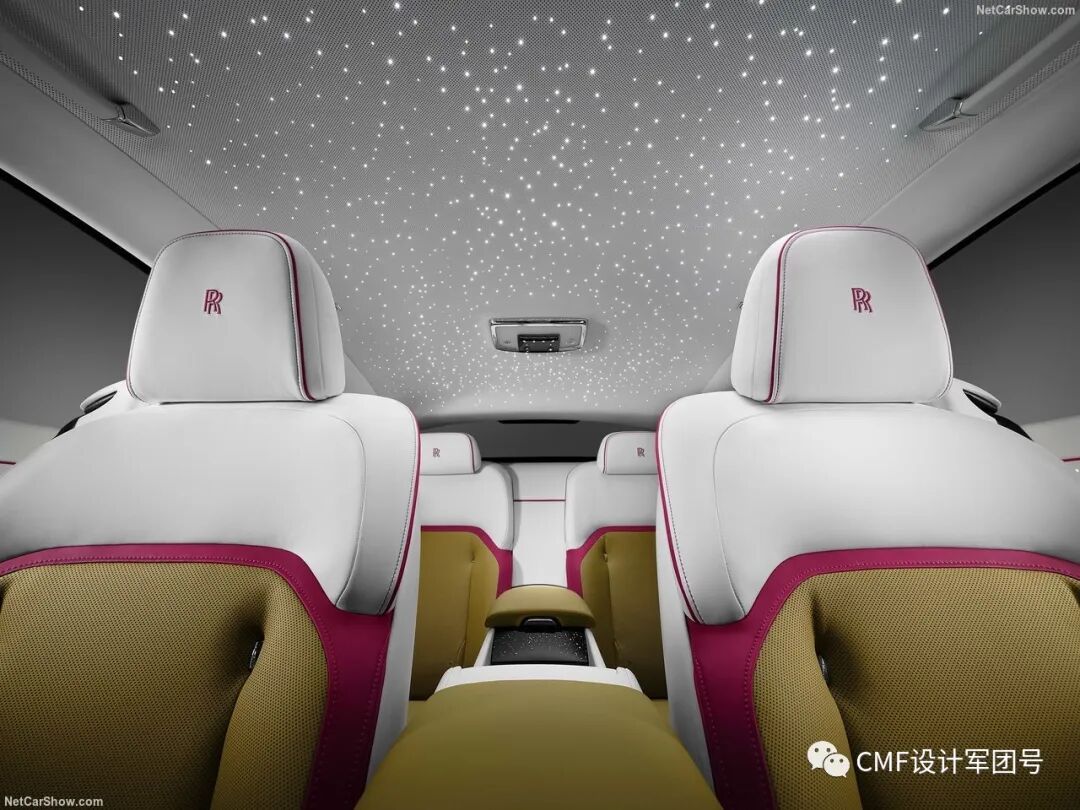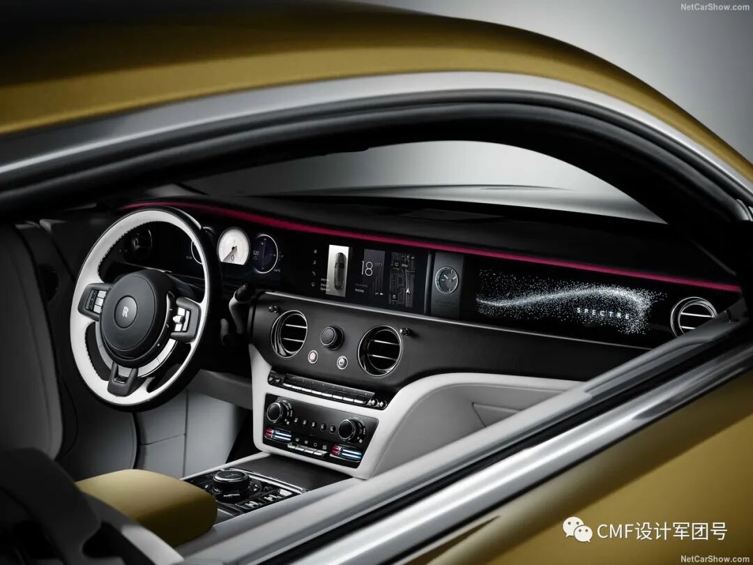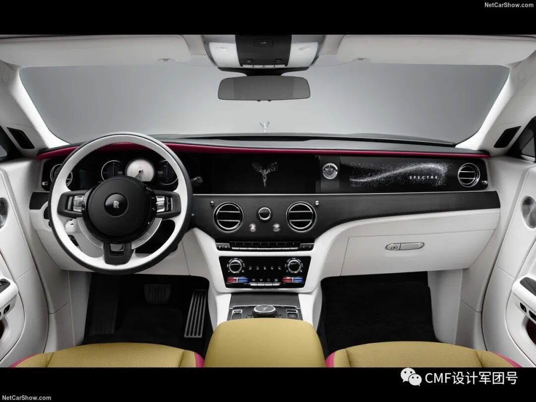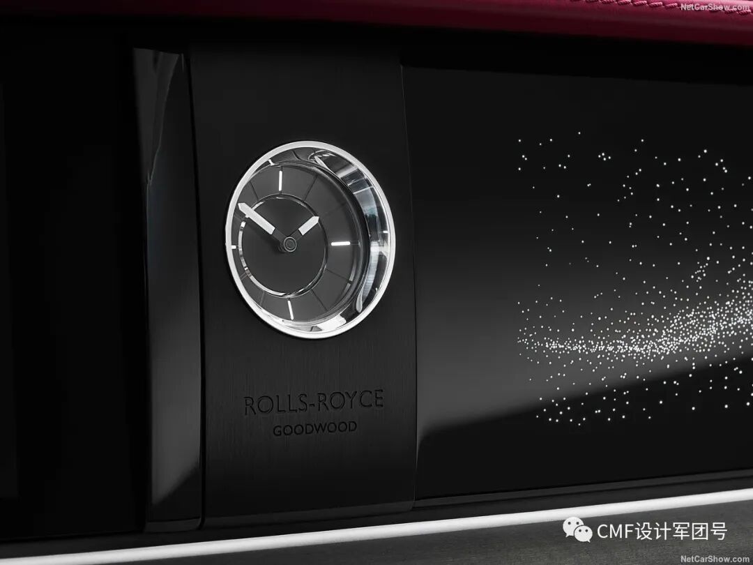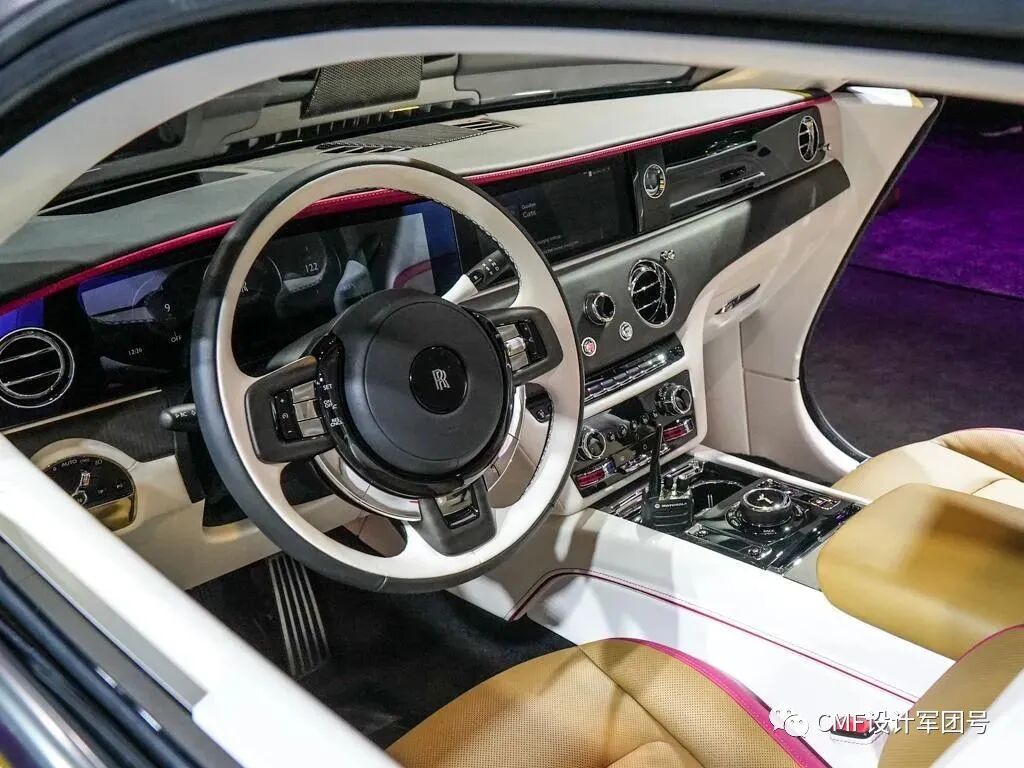 拥有很多带有豪华感的设计元素,包括中控屏旁边的机械钟表、定制化刺绣及滚边装饰等。