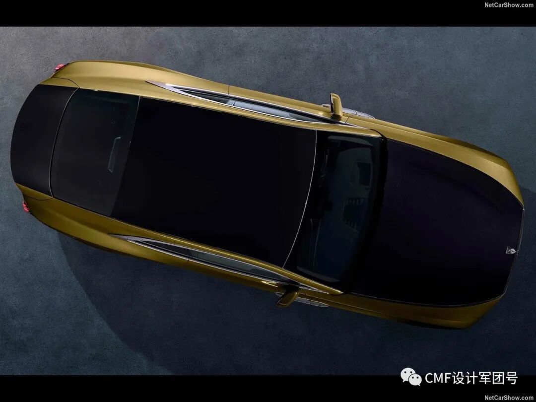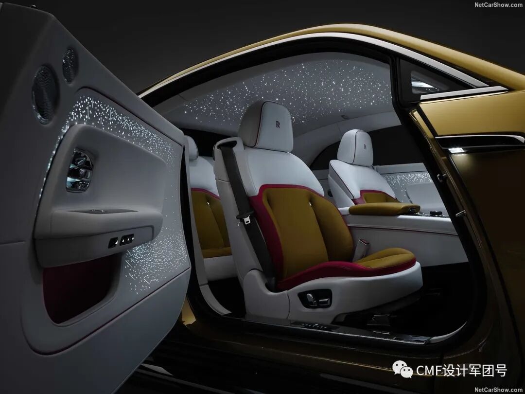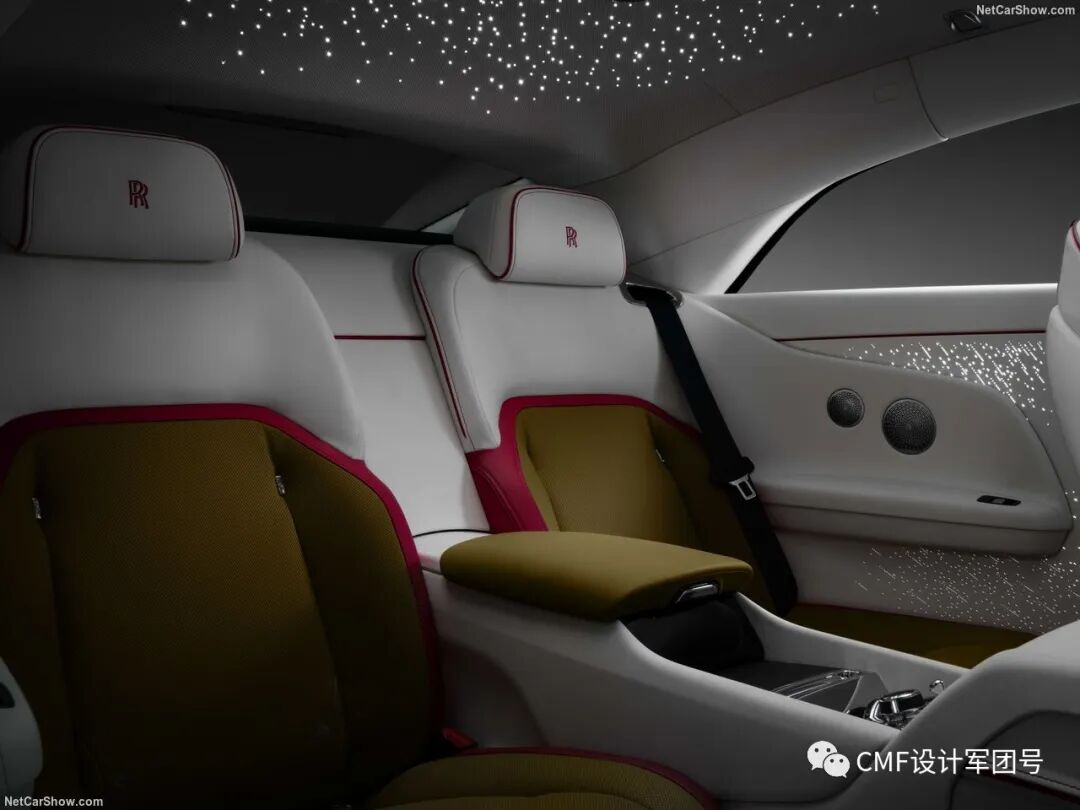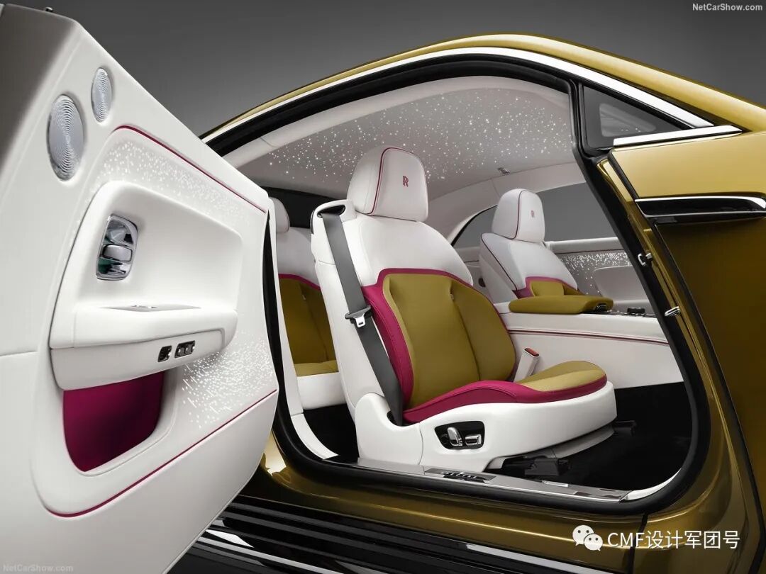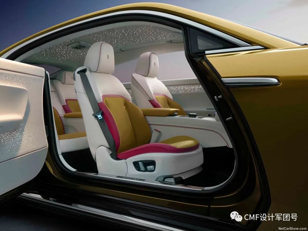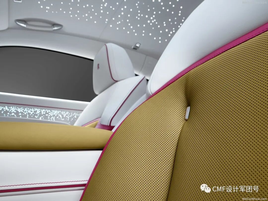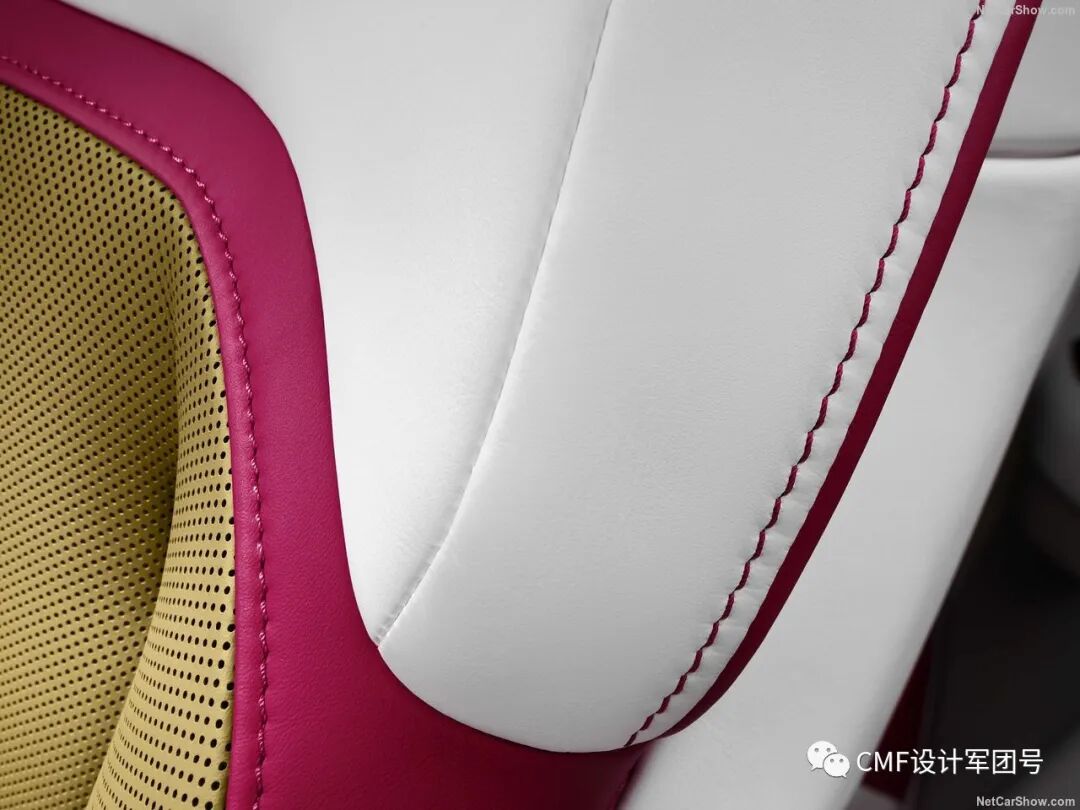 内饰整体采用金色、白色及黑色三色撞色设计。另外粉红色则作为边缝衔接的点缀色,主要集中在座椅及仪表板位置。金色部分呼应外饰金色漆层,采用密集的打孔工艺装饰。方向盘采用内外黑白双色设计,总而言之,内饰整体色彩的视觉层次感十足;