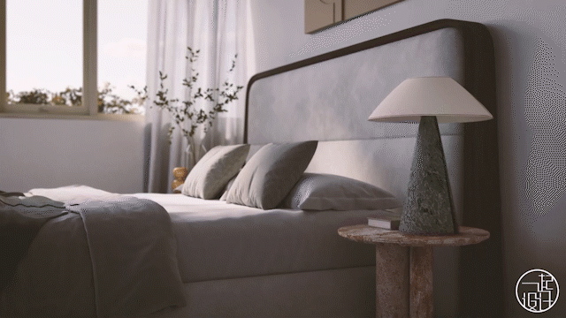 床边的大理石床头柜与绿色大理石台灯,为卧室增添了色彩与质感,同时也带来了优雅氛围。