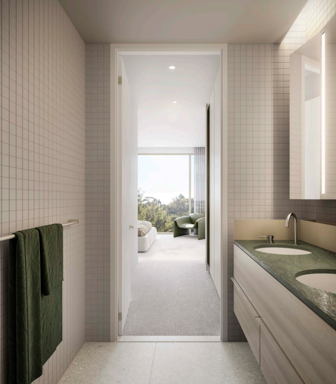 卫生间的地面与墙面分别选用灰色水磨石与白色格子瓷砖铺贴,洗漱区的绿色大理石台面设计,与室外的自然色彩相呼应。