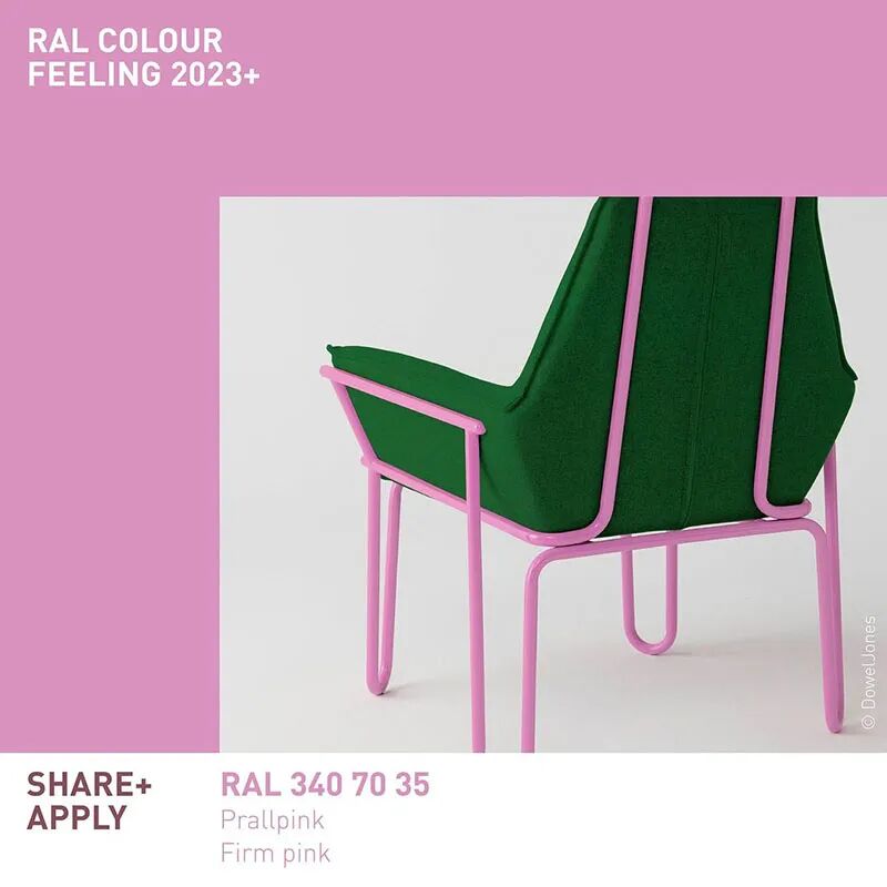 RAL 340 70 35的色相来自品红区域(340°),具有相对较高的明度(70)和相对较高的彩度(35)。满粉是一种快乐和充满力量的表达。这种自信的、人造感的颜色传递出一种创新和俏皮的活力。适用全部光泽饰面。然而,少量使用通常就能达到目的。大规模地使用应该限制在人们只停留较短时间的领域。