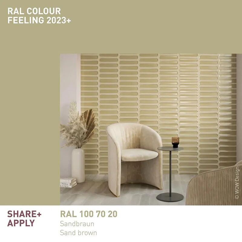 RAL 100 70 20是一个色相位于黄绿区域(100°)的颜色,具有相对较高的明度(70)和相对较低的彩度(20)。沙棕色是一个平静的、受自然启发的颜色,第二眼就会发现它滋养之美。因为它与许多其他颜色和谐匹配,因此沙棕是一个华丽、更大气的选择,可以取代经典的中性色。避免光泽的饰面,与有机的形状搭配效果很好。这个颜色与干净的线条搭配看起来也很棒。