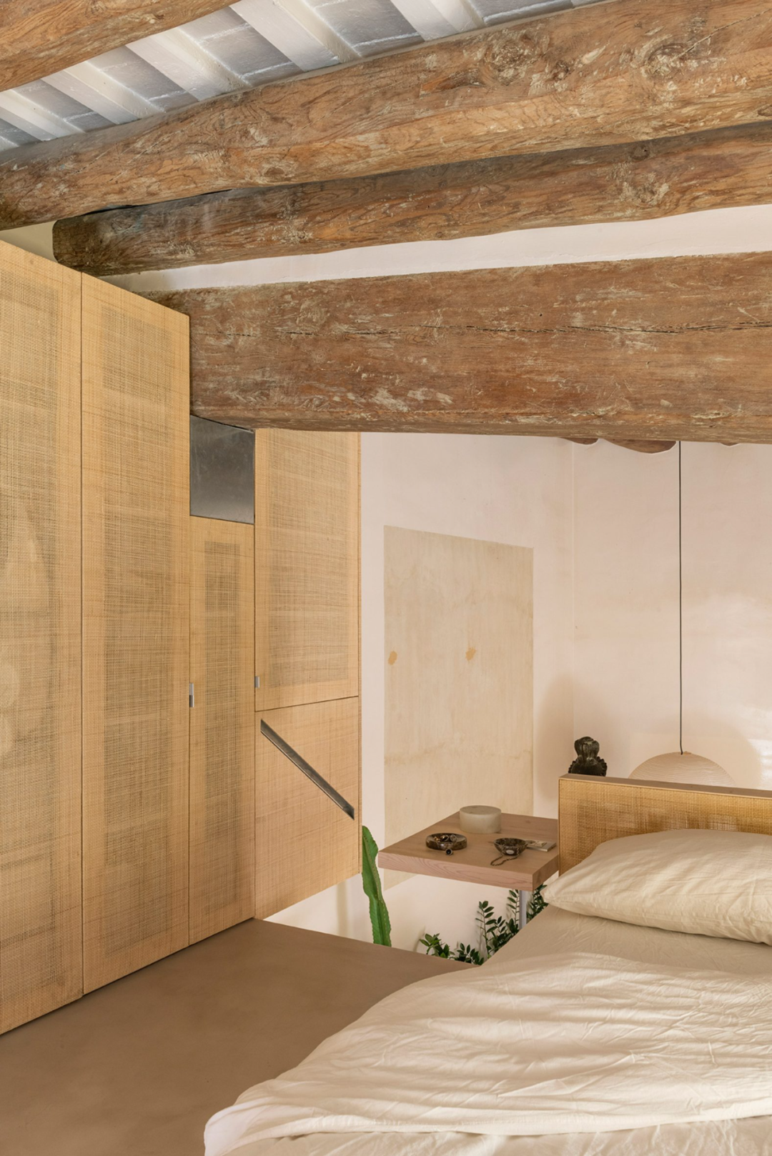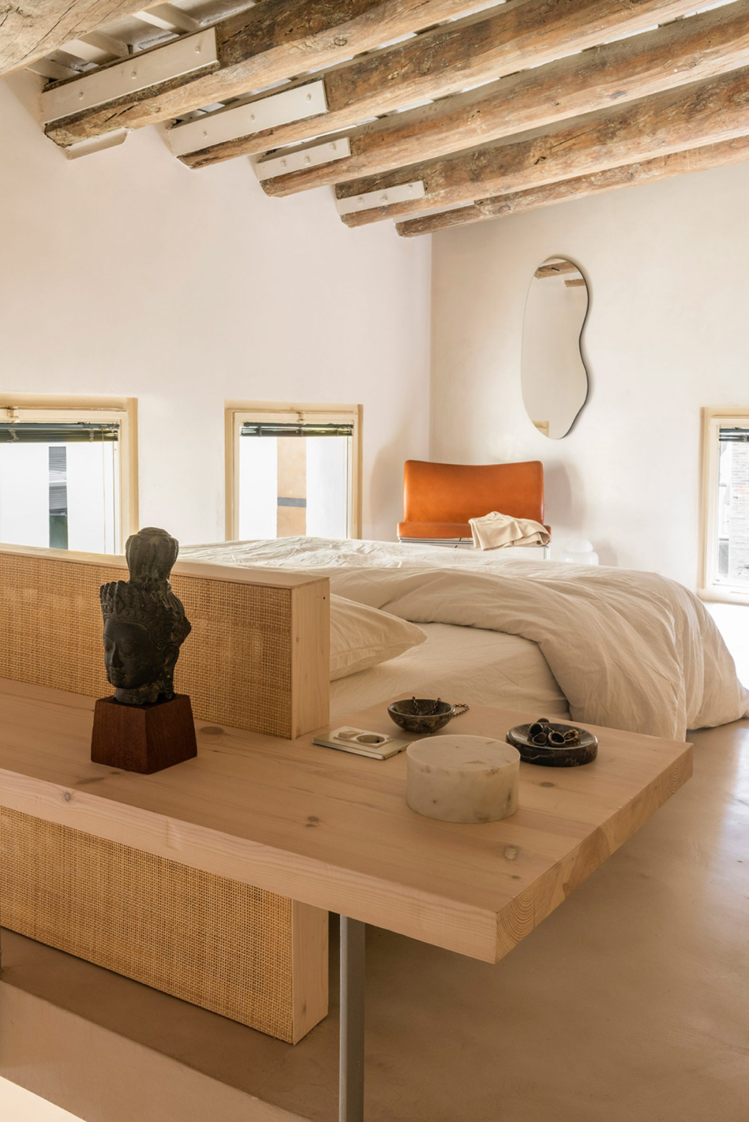 卧室位于公寓的夹层,顶部粗壮的木梁是对原建筑结构的保留。