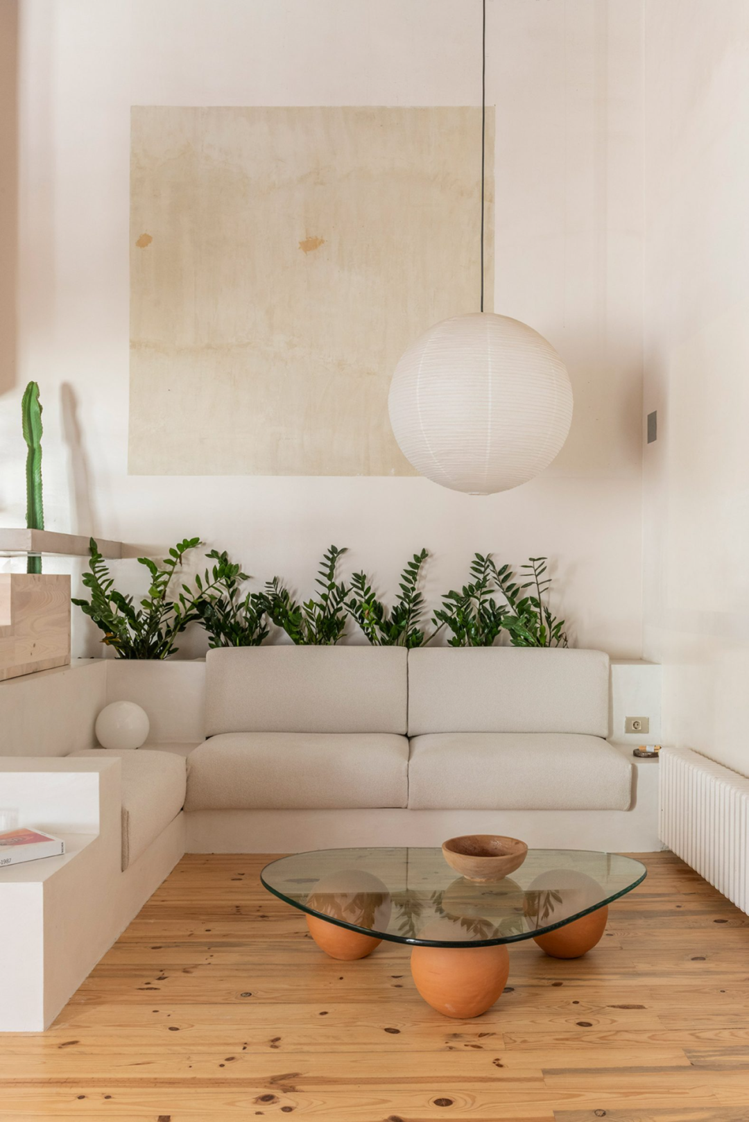 楼梯另一侧作为客厅区域,双人布艺沙发刚好嵌入,前方放置三角形的玻璃面茶几,顶部悬吊一盏球形吊灯与茶几桌脚相呼应。