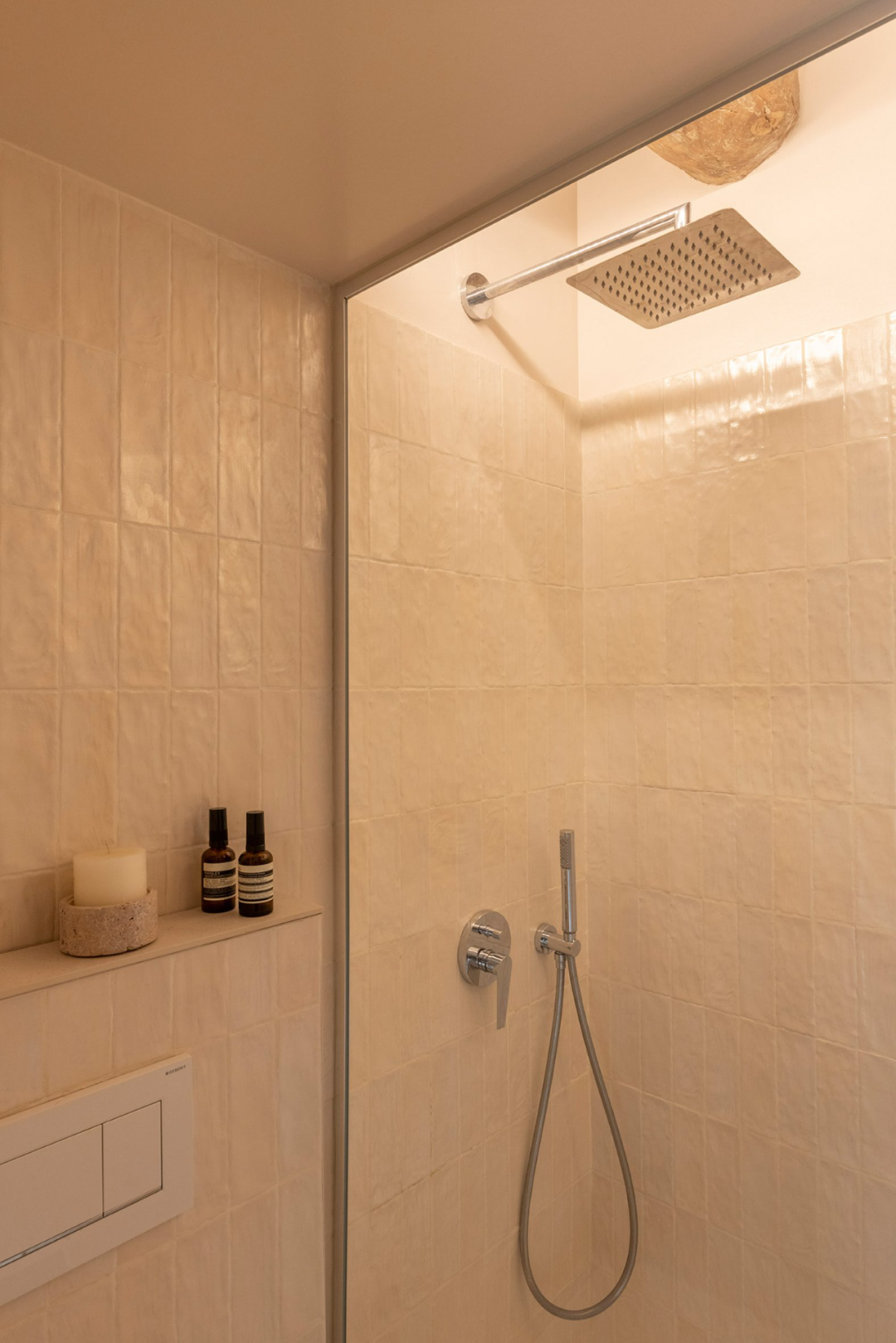 卫生间内墙面铺贴珍珠母竖条瓷砖,方便清理又能起到防水防潮效果。