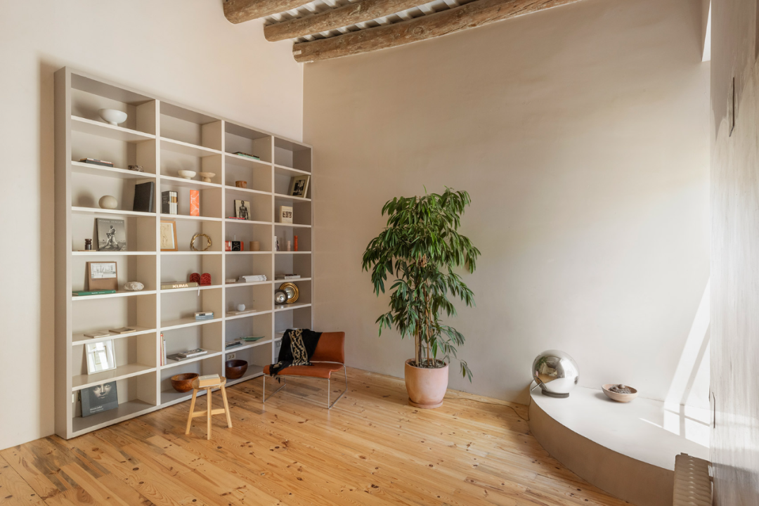 客厅区域正对着一个开放式空间,这里放置了一个4X8 规格高 3.5 米的书架,搭配皮质靠椅和板凳,窗户前还做了地台,配上绿植和摆件,显得十分悠闲。