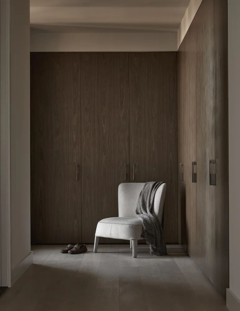 公寓的入口非常狭小,但也不浪费一处面积,为住客提供更好的居住体验,用墙面相同的石材设计了一处可供临时等候的「石凳」。