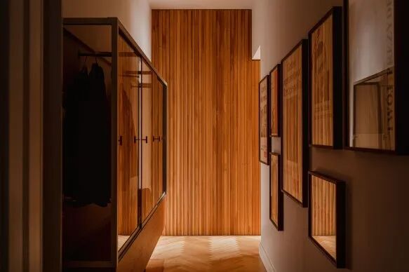 进入公寓,玄关处是一条长走道,走道两侧墙面是上下两色的设计,左边是矩形玻璃衣柜,右边则用同形状挂画来呼应。