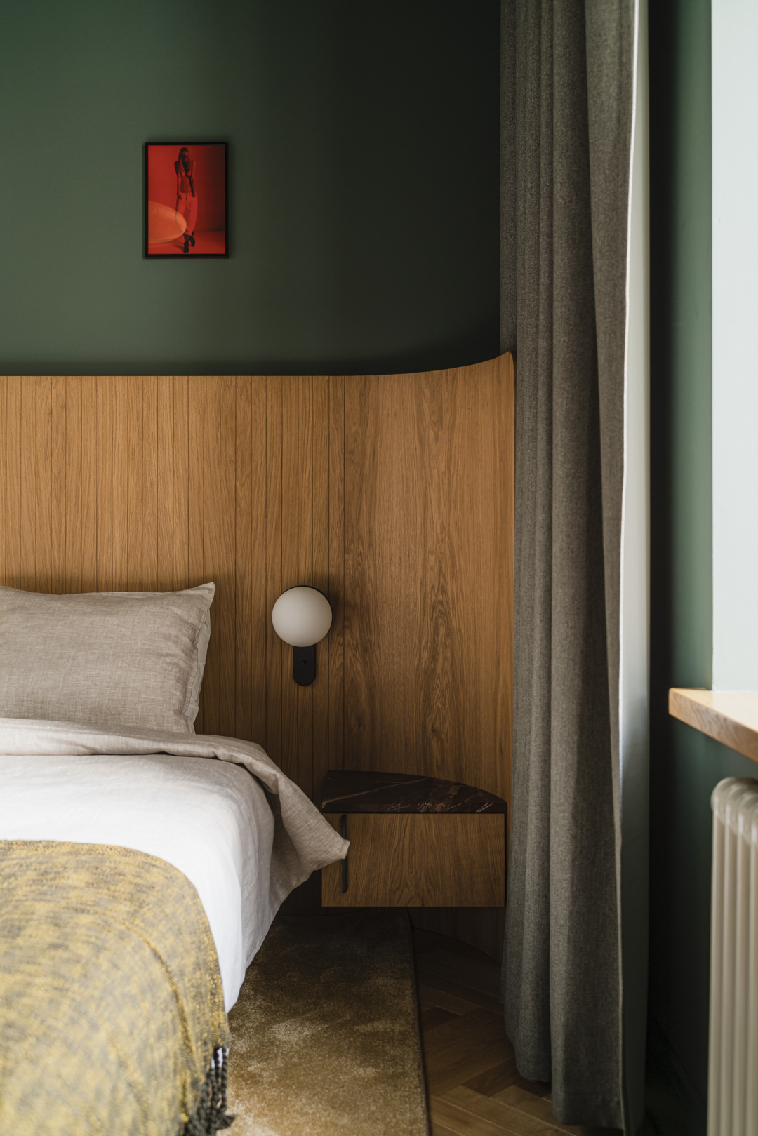 浴室与走廊尽头三角形空间,设计师将衣柜巧妙得隐藏在雕刻木板的后面。解决了不规则空间的难题,完美得利用了空间。