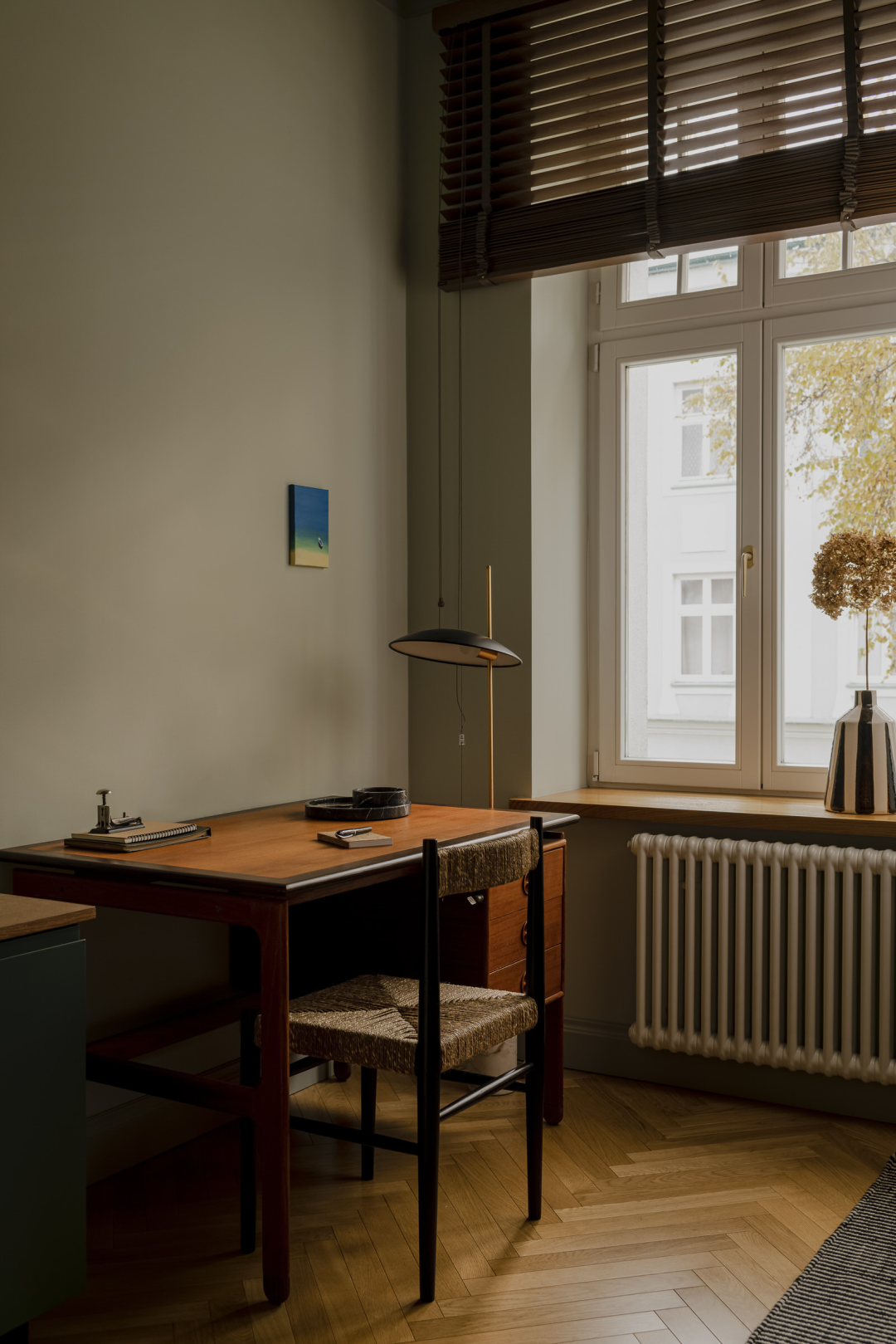 厨房小而整洁,更像是一个家具,而不是独立的厨房空间。与其设计一个吸引房间注意力的厨房,不如这样一个合适的小厨房,可以保持空间的平衡。