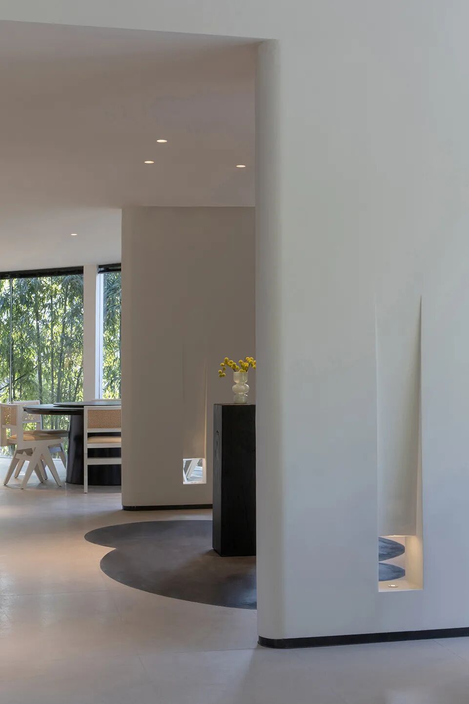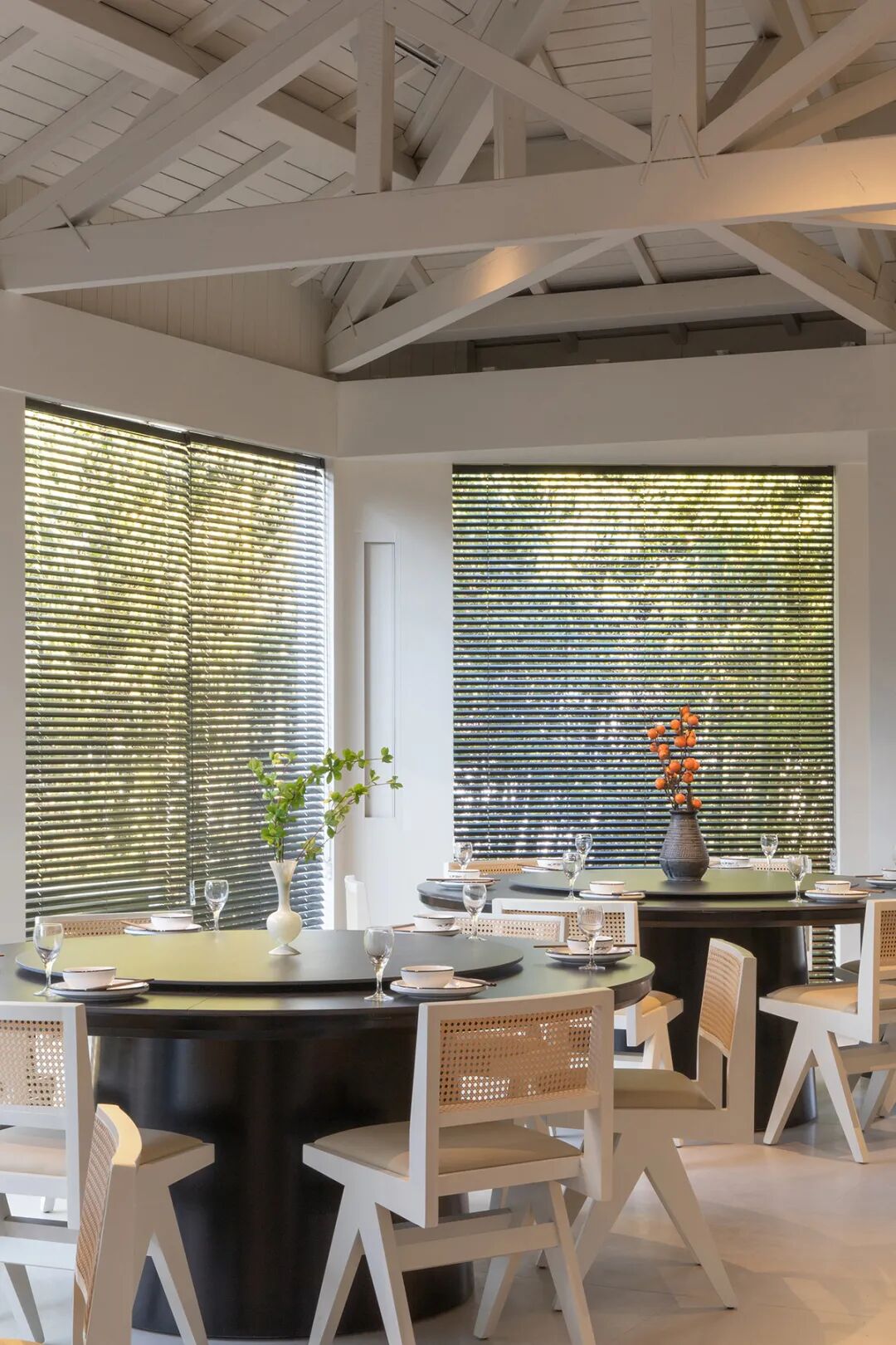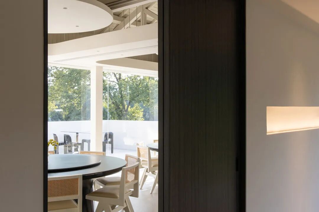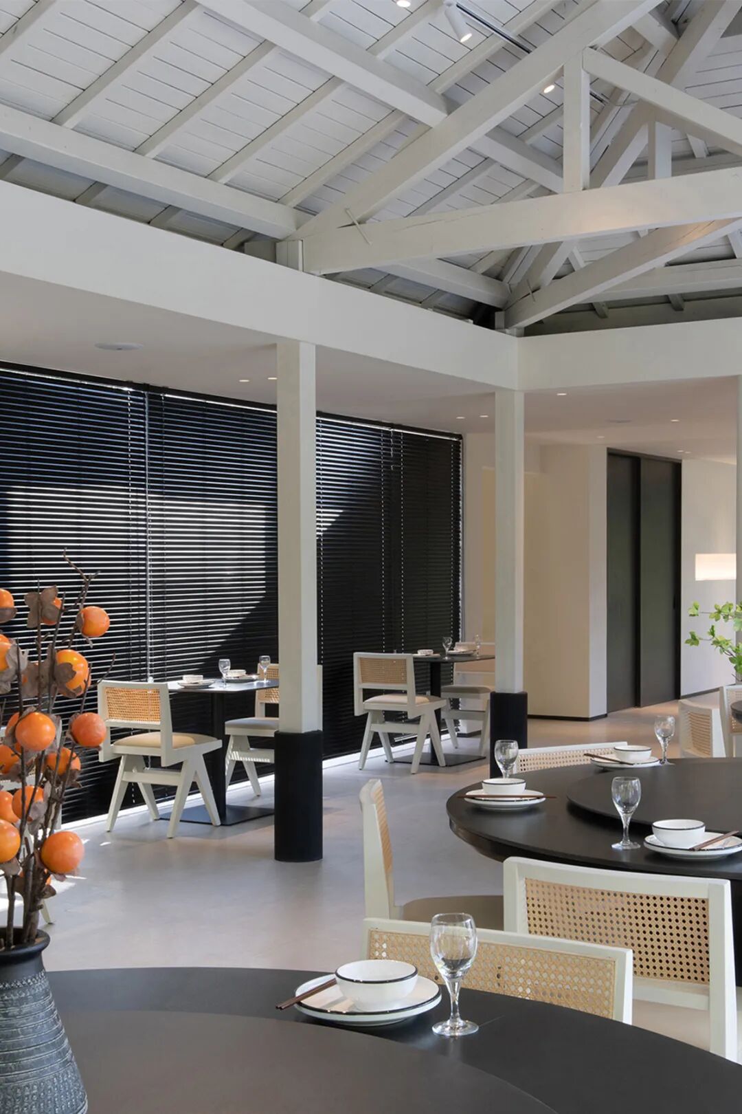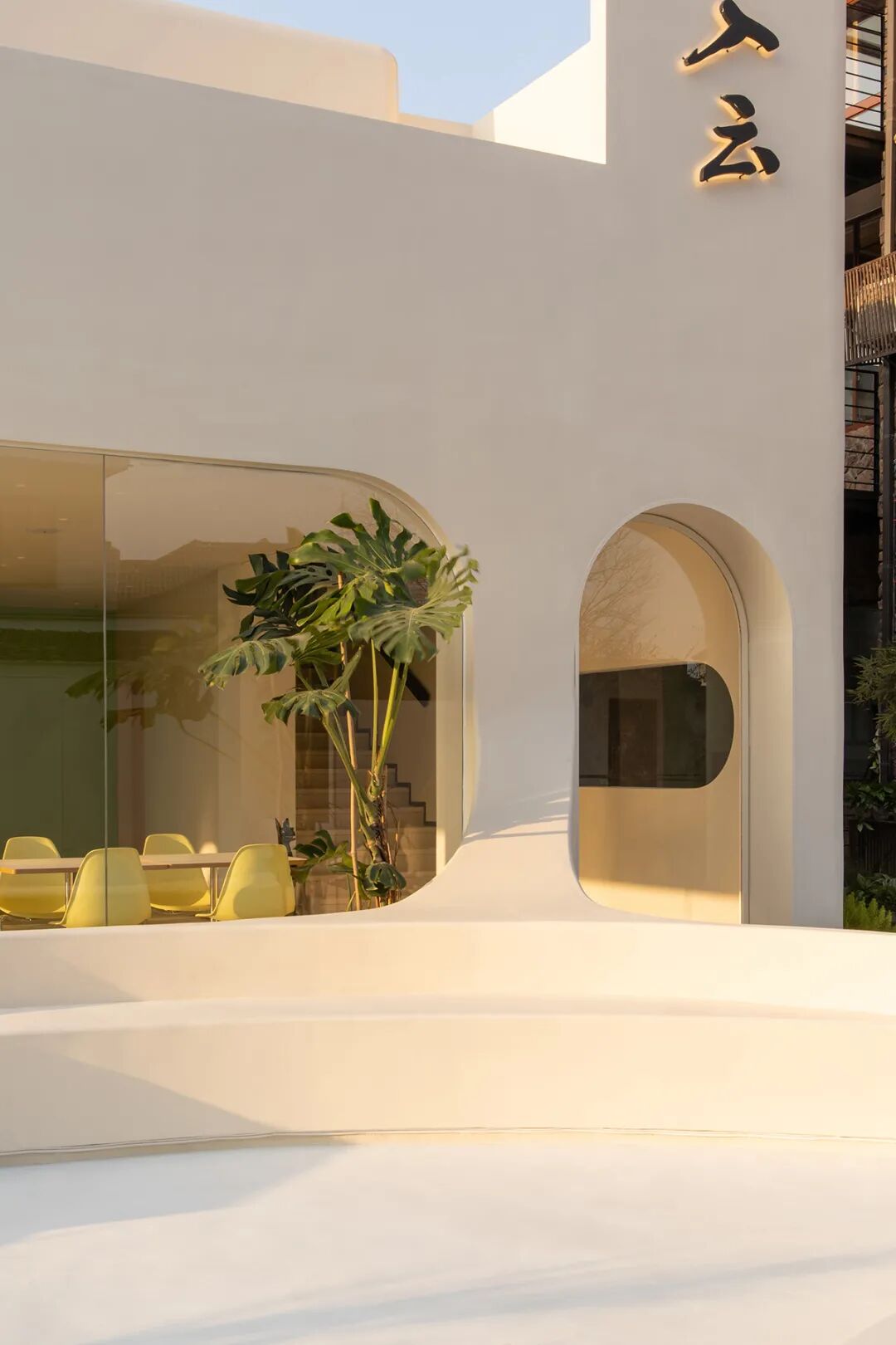 在不改动原建筑主体和高效改建的要求下,将其套上一层“外衣”,东侧高墙封闭,保证了餐厅内部的私密性,而面对西南面,则通过大面积玻璃与室外连接。屋顶檐沟外包结构与建筑外立面形成统一语言。因为建筑可建的空间有限,所以通过户外结构与主楼连接的方式来增加建筑的视觉张力,室内外又能形成互动。“入云”的状态应该是柔软的,通过适度的弧线处理和白色搭配来实现进入空间的这种柔软的感受。