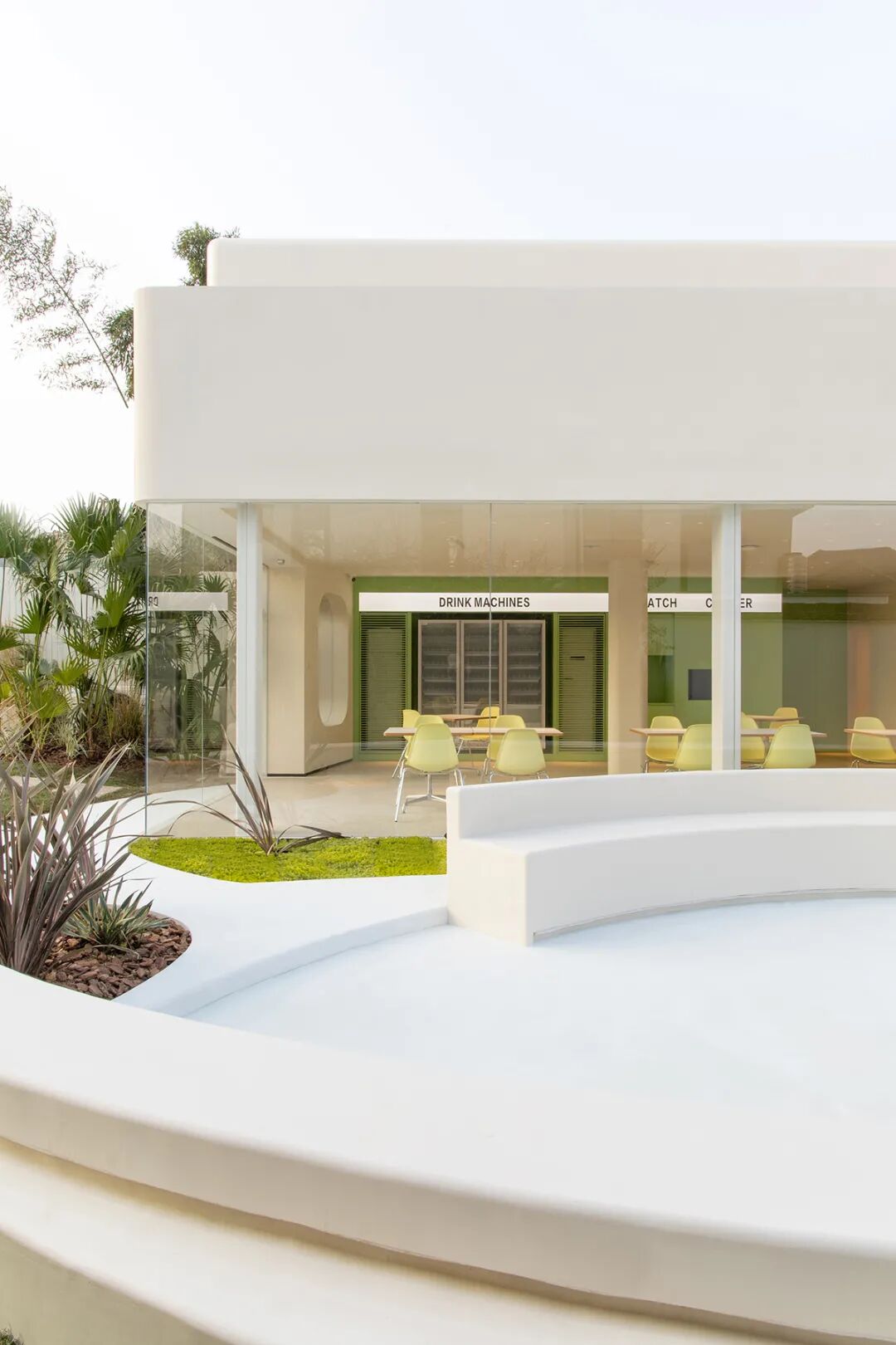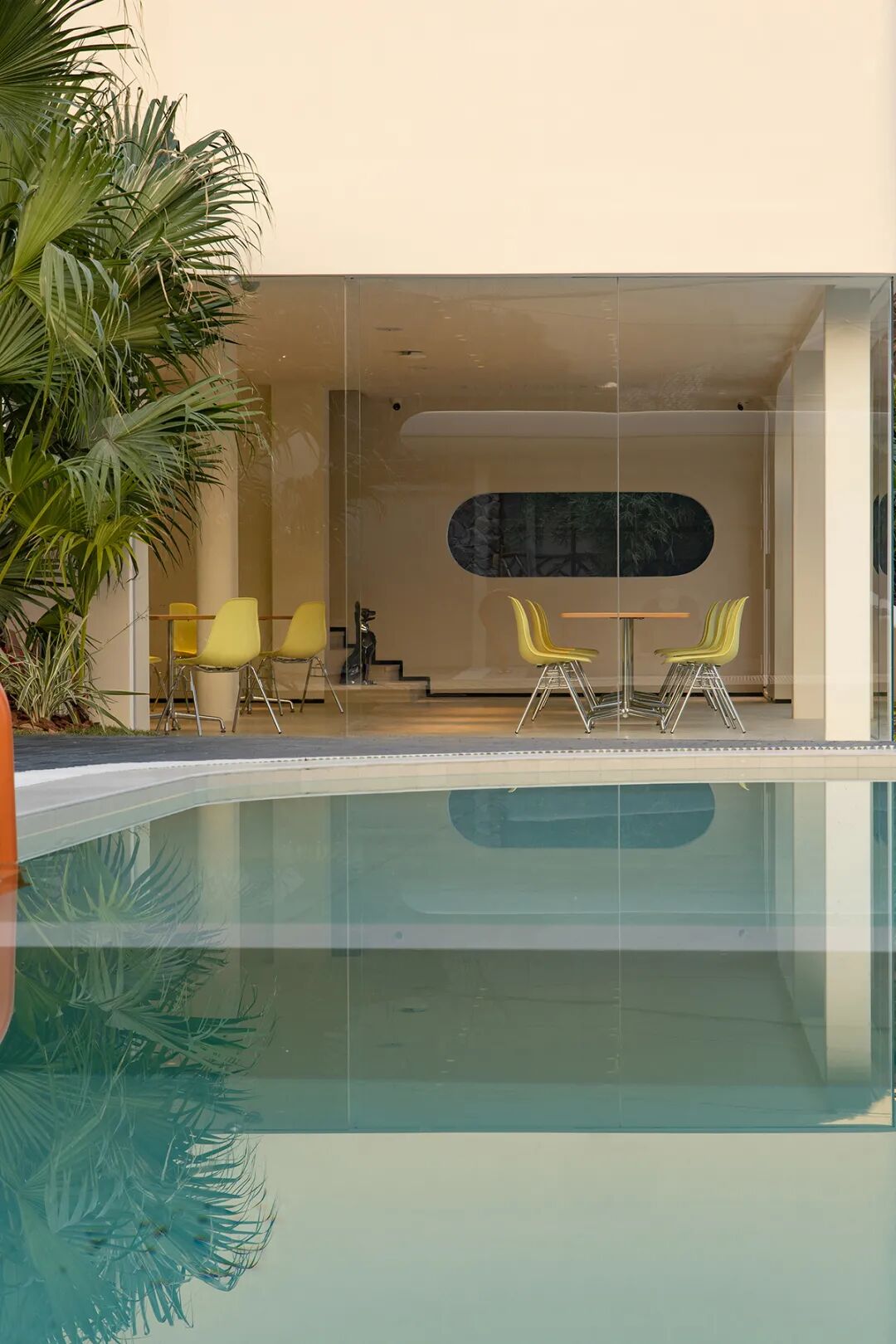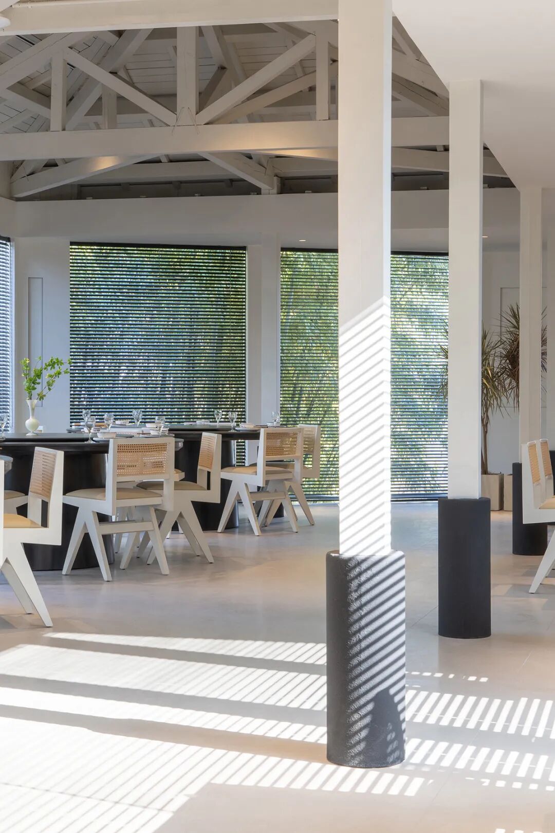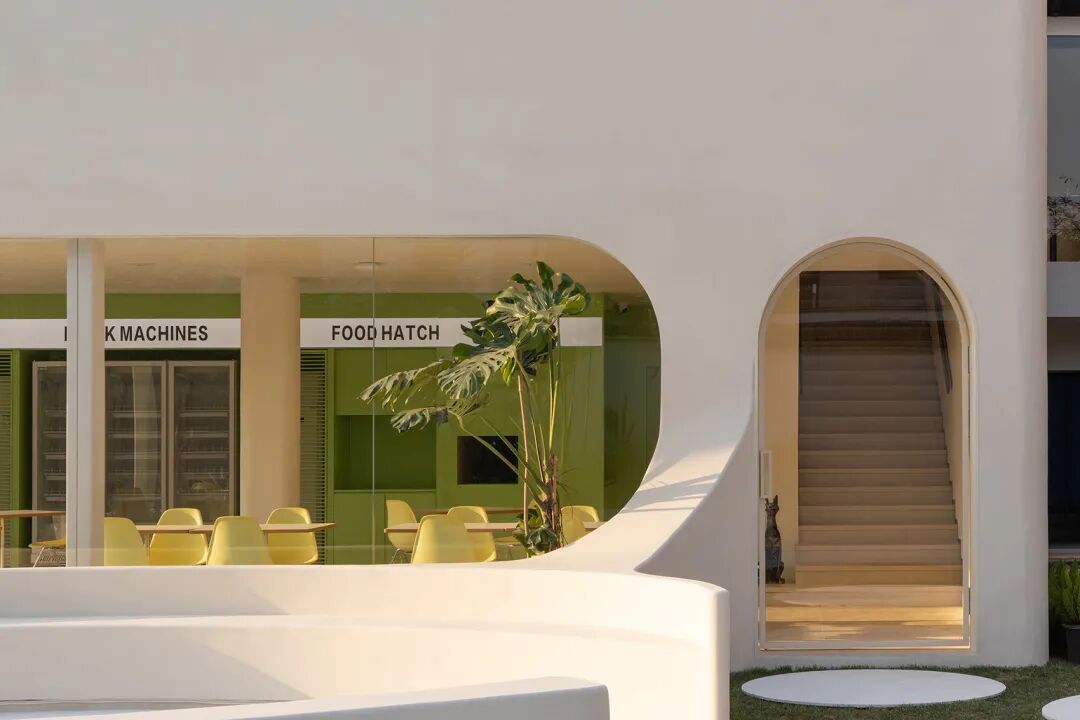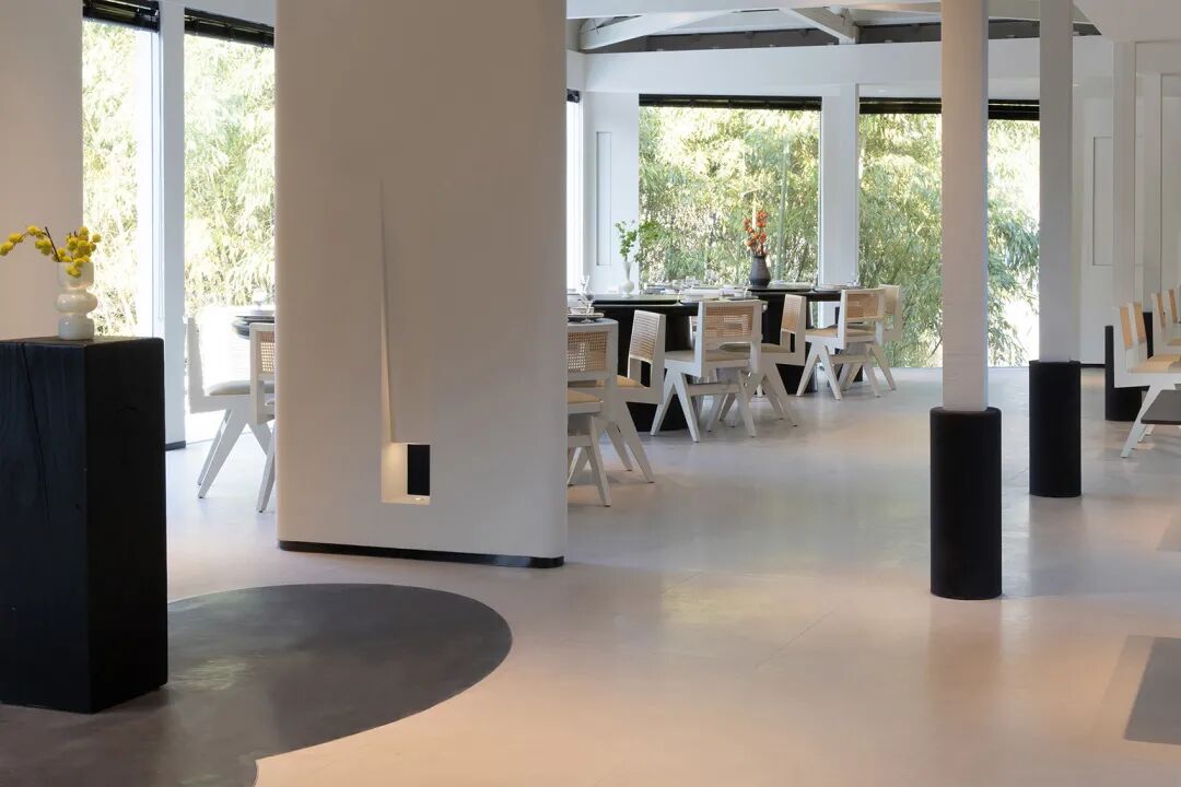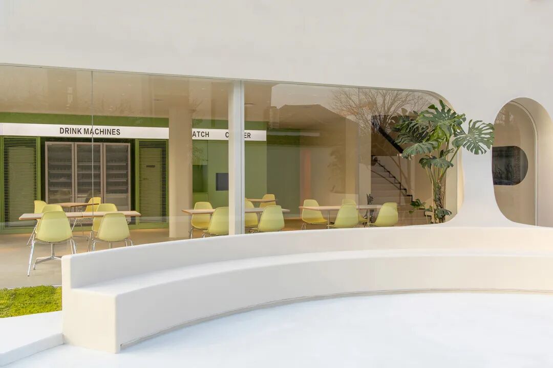 在不改动原建筑主体和高效改建的要求下,将其套上一层“外衣”,东侧高墙封闭,保证了餐厅内部的私密性,而面对西南面,则通过大面积玻璃与室外连接。屋顶檐沟外包结构与建筑外立面形成统一语言。因为建筑可建的空间有限,所以通过户外结构与主楼连接的方式来增加建筑的视觉张力,室内外又能形成互动。“入云”的状态应该是柔软的,通过适度的弧线处理和白色搭配来实现进入空间的这种柔软的感受。