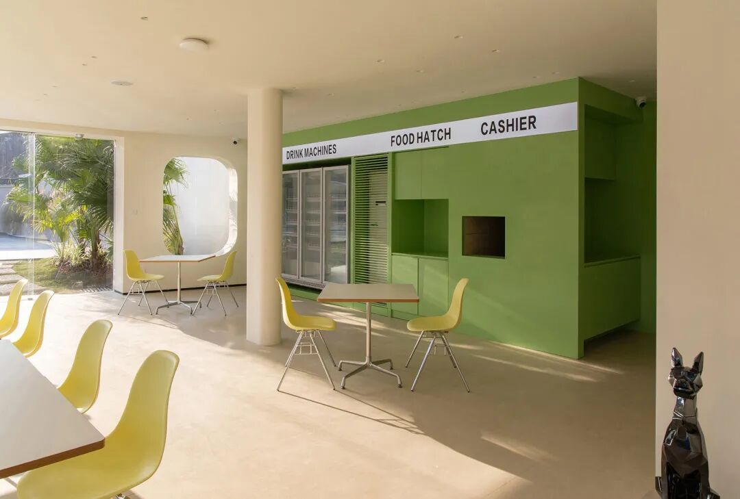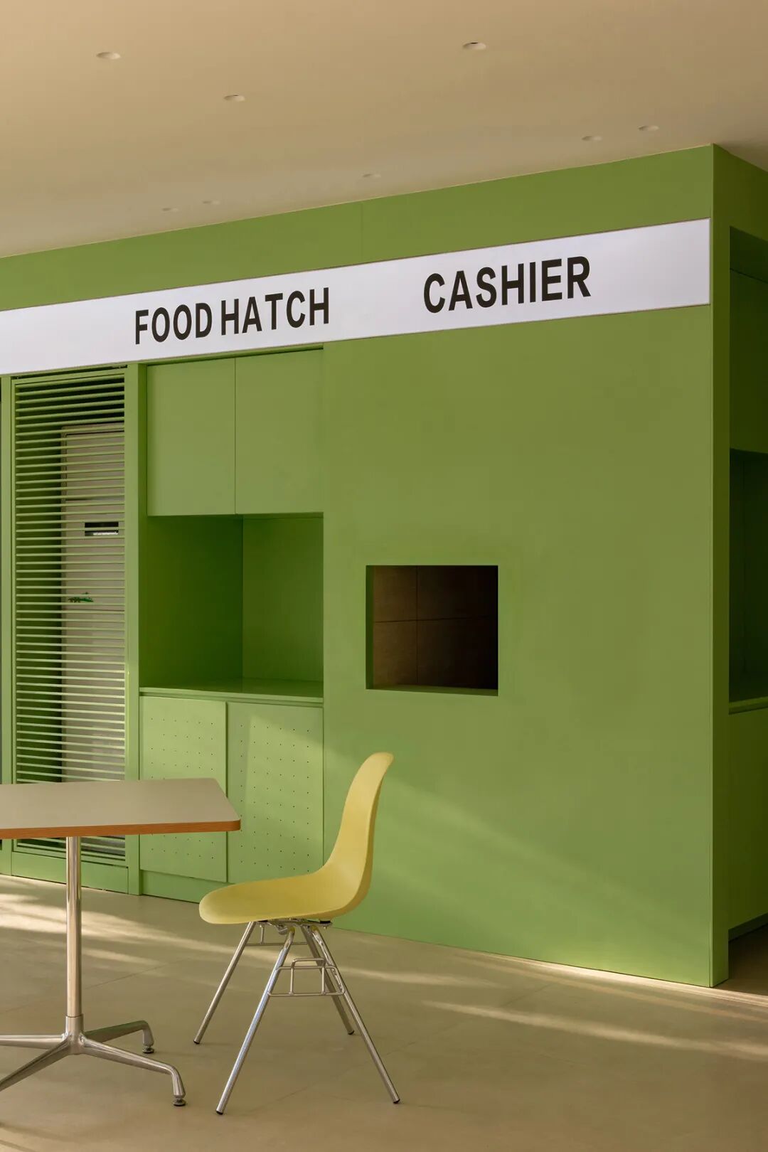 一楼用餐区与厨房的隔墙设置了一整面绿色的功能性墙面,将饮料柜、空调、备餐台、传菜窗、收银台等统一收纳的同时又是一楼和户外的视觉焦点。