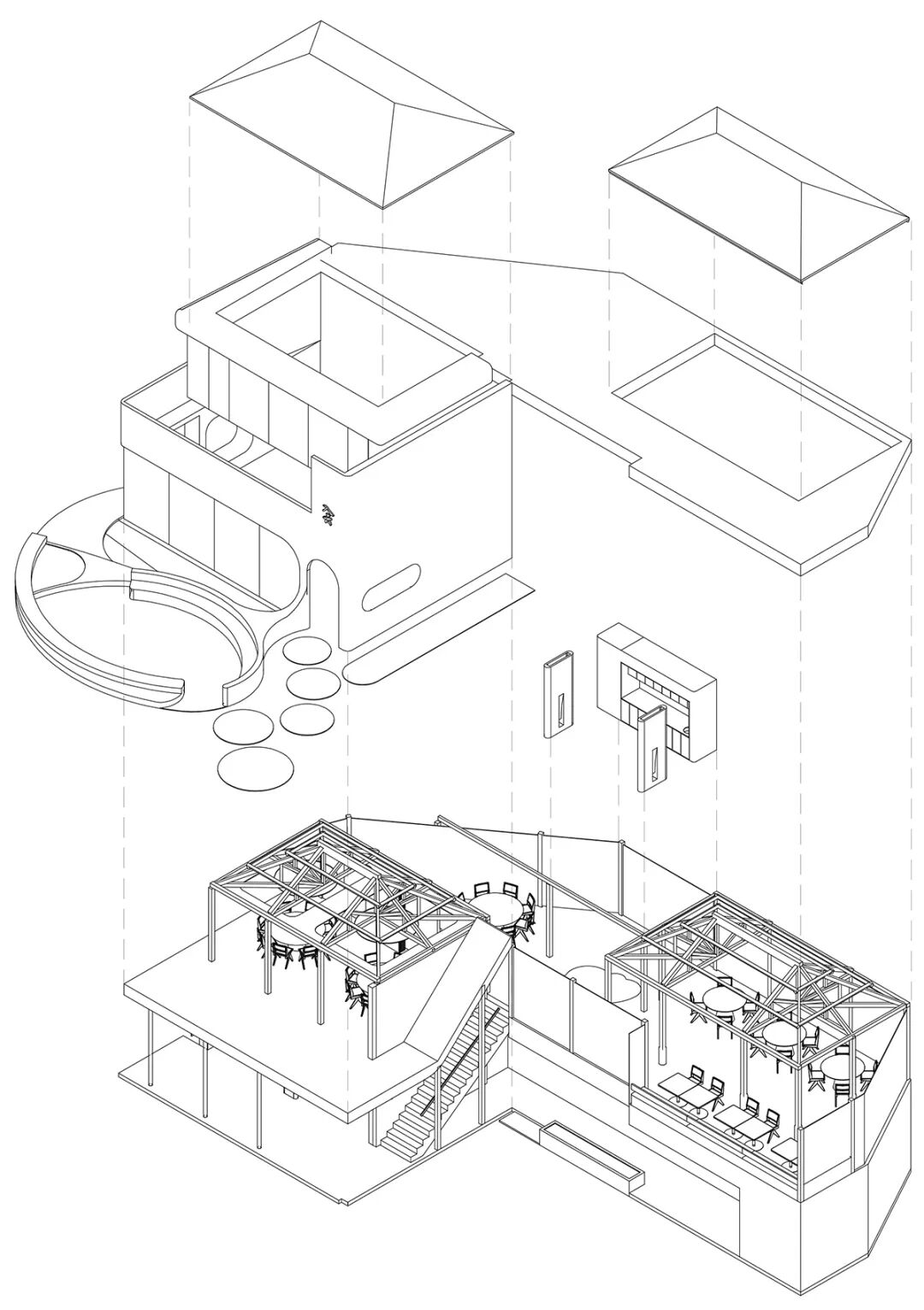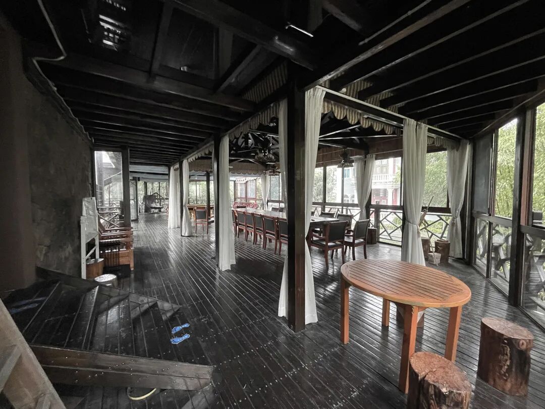 原建筑所在的场地东侧紧挨着居民楼,西侧视野开阔,北面是大片竹林,南面则是内部的草坪,主体内部木梁、柱子、栏杆、门窗等错中复杂,所以建筑主体有效地回应场地和内部结构的梳理是本次设计的切入点。