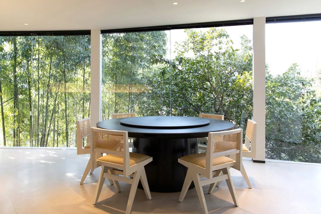 二楼全部木质结构刷白色,与建筑统一的同时改善了内部采光。北侧将原有的栏杆和铝合金门窗拆除,替换成大面积落地玻璃,将竹林引入室内。通过局部吊顶和立面结构增加,有效地梳理了复杂的木梁和柱子,形成以功能分区为目的的自身逻辑。
